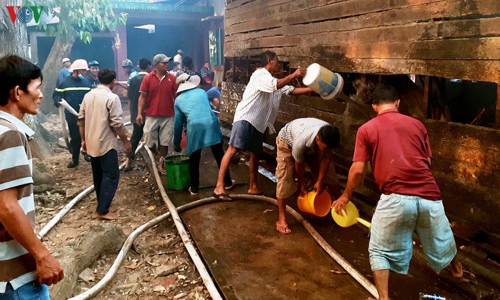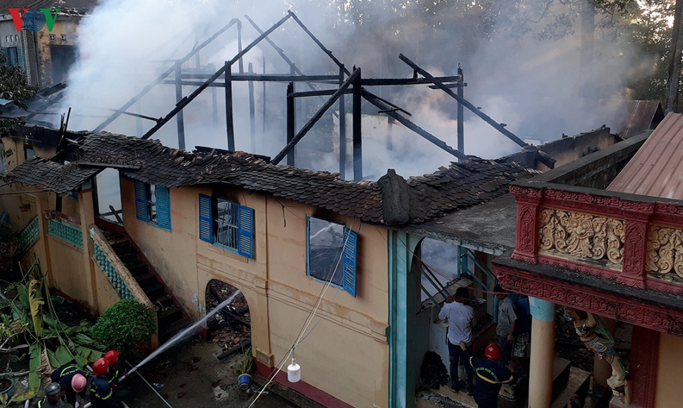 Theo người chứng kiến, ngọn lửa bốc lên từ bên trong tăng xá và nhanh chóng lan ra thiêu rụi hàng chục tượng Phật, bàn thờ, sàn gỗ, cột, kèo và toàn bộ mái ngói cổ bị đổ sập.