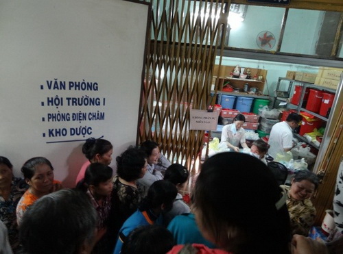 Bệnh nhân ngồi chật kín phòng khám. Đi qua một lối nhỏ vào căn bên trong cùng là phòng phát thuốc ngay chân cầu thang, cửa phòng thuốc chỉ có khoảng trống chừng ba mét vuông, bệnh nhân ngồi chật kín, thậm chí ngồi cả lên bậc cầu thang chờ phát thuốc. Trên lầu một có phòng châm cứu cũng đông bệnh nhân, trên lầu hai là phòng làm việc. Quy mô tổ chức cho thấy phòng khám đông y đơn giản hơn tây y, không trang bị nhiều máy móc y tế, các thầy thuốc chủ yếu bắt mạch chẩn đoán bệnh và kê đơn cho bệnh nhân.