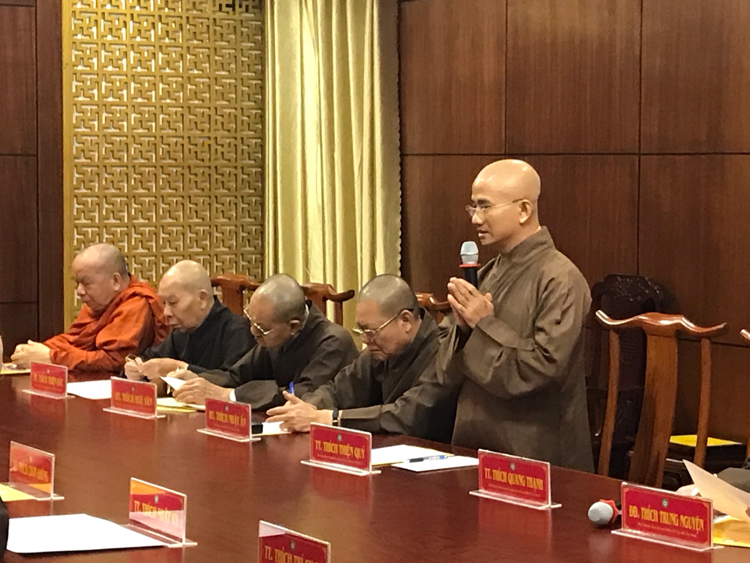 TT.Thích Thiện Quý – Phó Trưởng ban, Chánh Thư ký Ban Trị sự GHPGVN TP.HCM báo cáo về công tác chuẩn bị cho lễ an vị tôn tượng Bồ Tát Quán Thế Âm dự kiến sẽ diễn vào lúc 6 giờ 00, ngày 17/10/2019 (nhằm ngày 19/09/Kỷ Hợi, tại Việt Nam Quốc Tự số 242 – 244, đường 3/2, phường 12, Quận 10, TP.HCM.