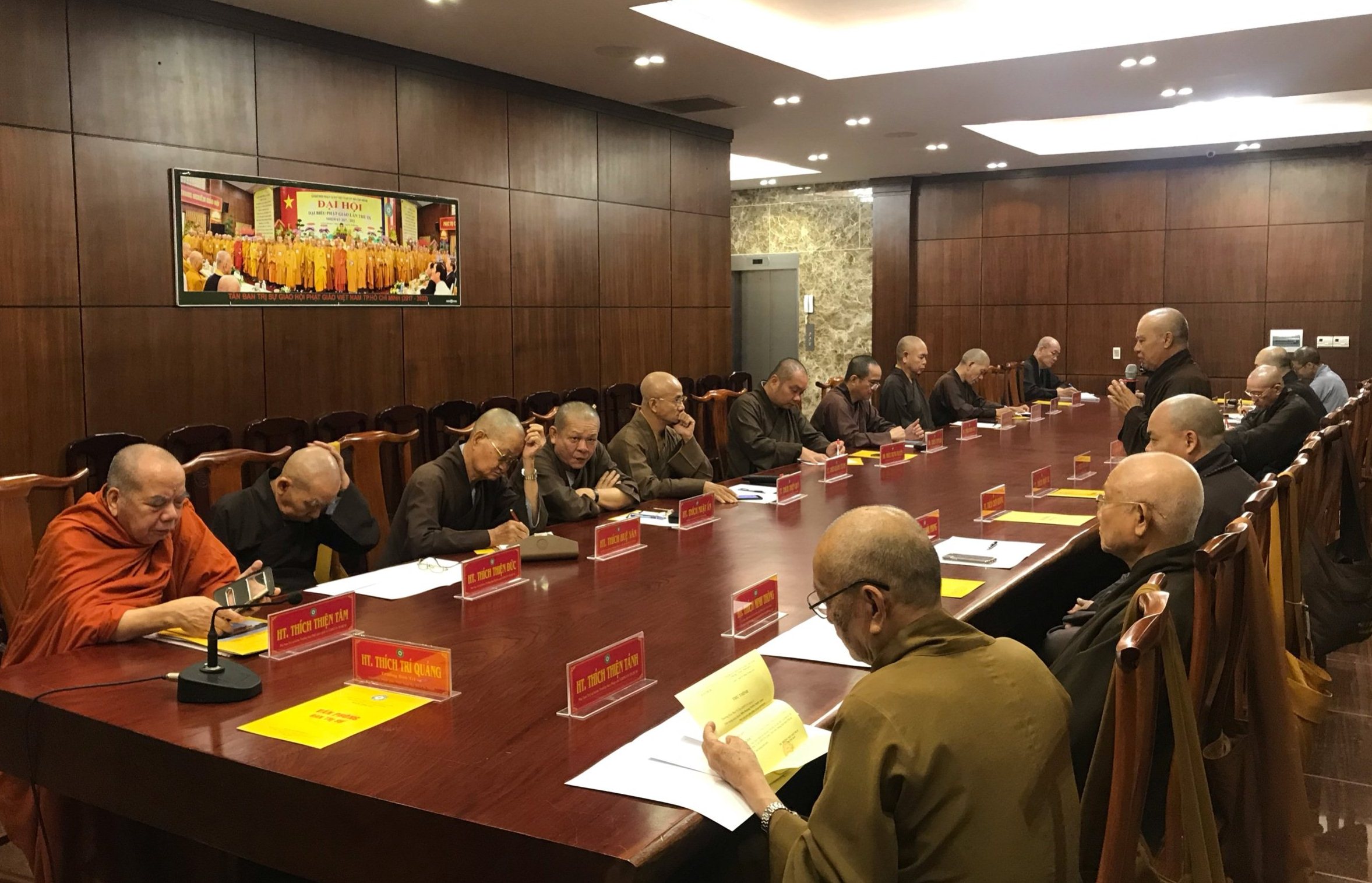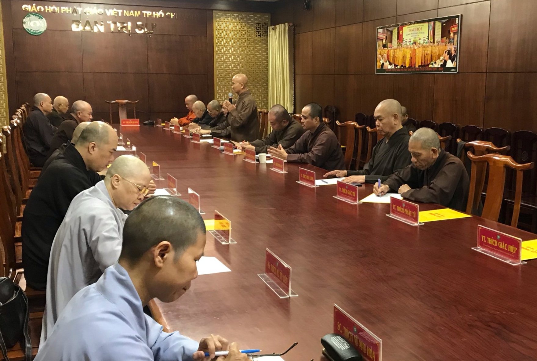 Phiên họp có sự hiện diện của chư tôn đức Phó Trưởng Ban trị sự GHPGVN TP.HCM cùng chư tôn đức Thường trực Ban Trị sự, Trưởng các ban chuyên ngành trực thuộc GHPGVN TP.HCM.