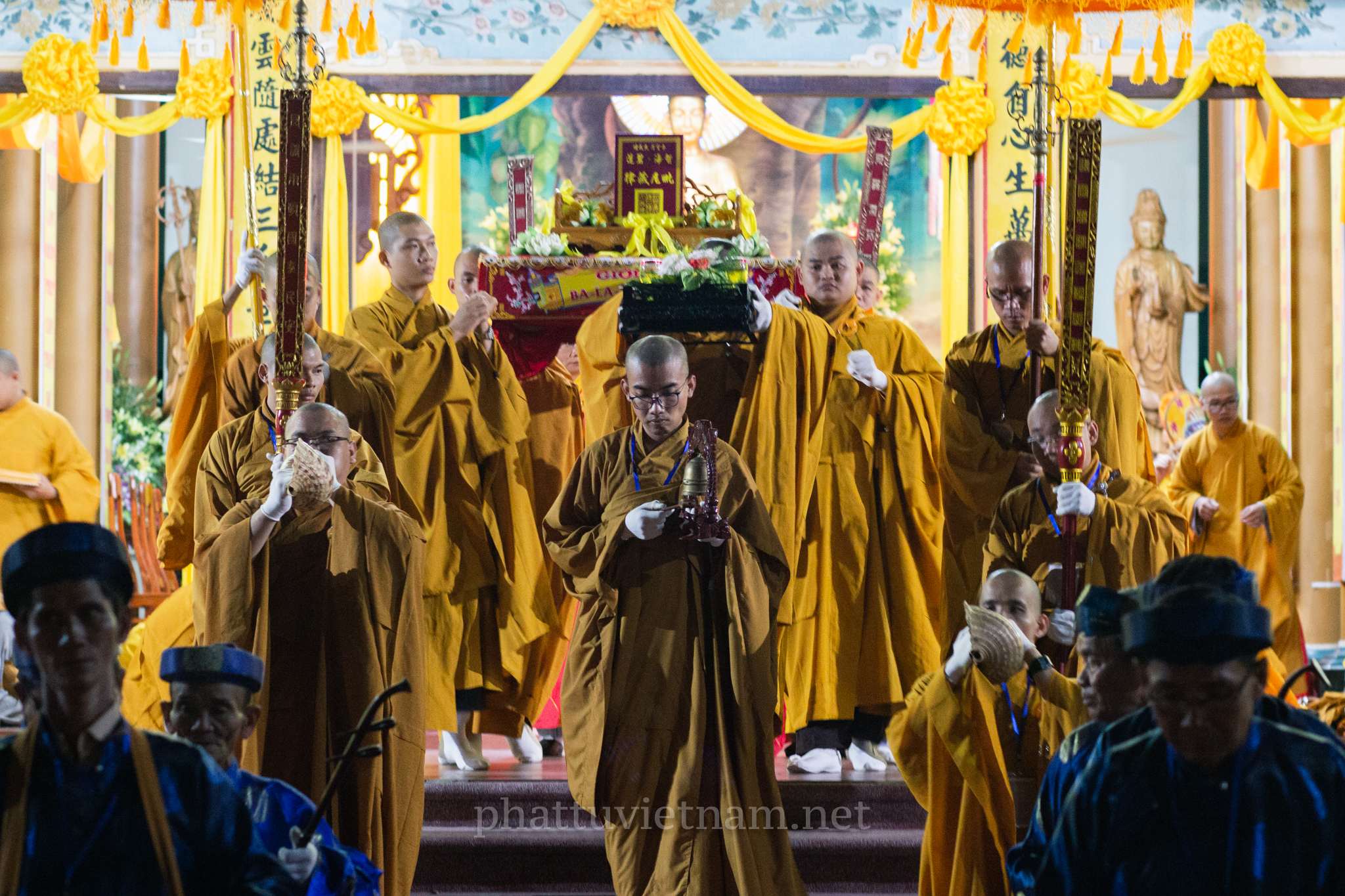 Các giới tử theo sự hướng dẫn của ban dẫn thỉnh lần lượt cung thỉnh Hoà thượng Đường đầu, Hoà thượng Yết ma A-xà-lê, Hoà thượng giáo thọ, chư tôn đức tôn chứng.