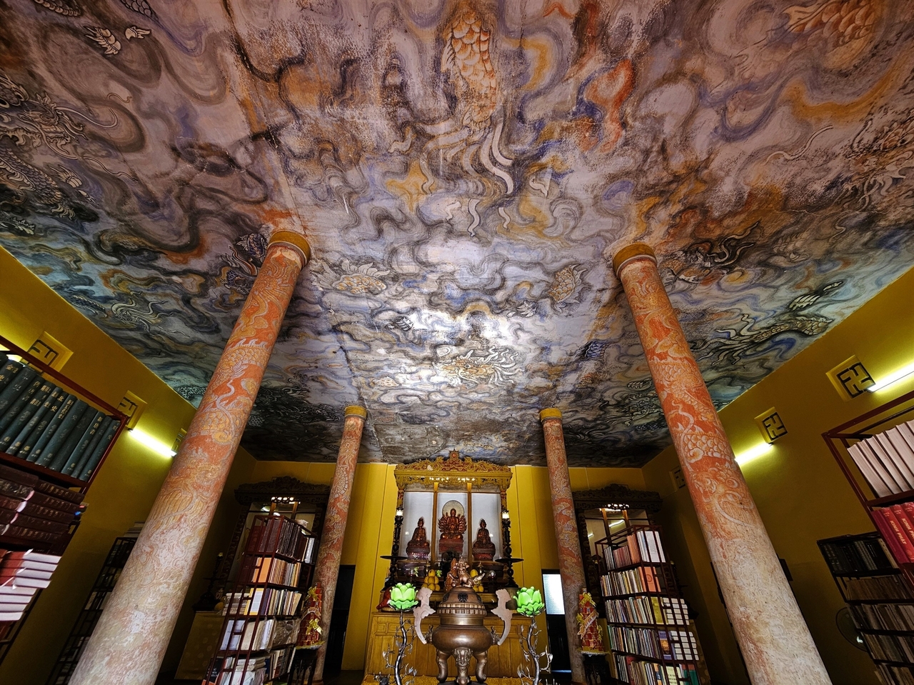 Nhìn từ dưới lên, tác phẩm “Long vân khế hội” vẫn nguyên vẹn và lung linh, như chưa hề có sự thay đổi, dịch chuyển trước đó. Bức tranh có chiều dài hơn 10m, rộng gần 11m, ôm gần như trọn trần của chánh điện, vẽ 5 con rồng uốn lượn ẩn hiện trong các tầng mây trên trần điện và 4 con rồng quấn quanh 4 cột trụ lớn theo một điển tích xưa của nhà Phật.