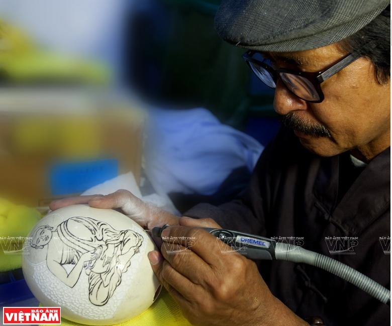 Từ những quả trứng đà điểu không đậu con, được mài bóng, nghệ sỹ Hoàng Thanh dùng bút sắc khắc họa tượng của Đức Phật, tượng của Đức Phật Quan Thế Âm Bồ tát, các chủ đề “Thập bát La hán đồ”, “Bát tiên” là những vị Bồ tát đã đạt được tam minh, lục thông và bát giải thoát. Những nét khắc tinh tế, không dùng màu, nhưng khi cho đèn vào các hình ảnh nổi lên sinh động. Từ câu nói của người xưa “ Khắc cốt ghi xương”, nghệ sỹ Hoàng Thanh đã khắc hình Địa Tạng vương Bồ Tát lên xương cá, lấy màu sáng trên xương làm ra được tác phẩm giống như thời cổ xưa đã làm.