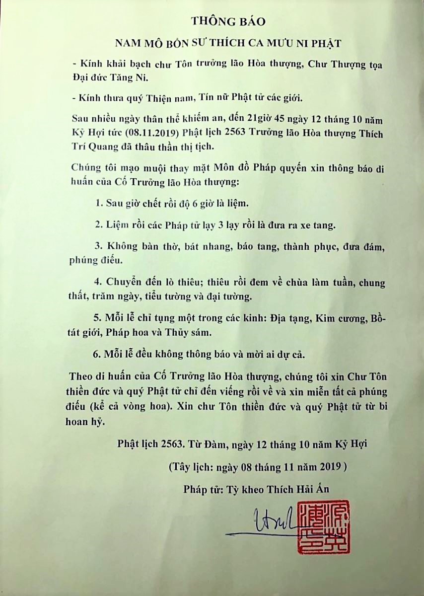 Theo thông báo của HT. Thích Hải Ấn, Trụ trì Tổ đình Từ Đàm, gởi đi ngày 8 tháng 11 năm 2019, di huấn của Cố Hòa thượng Trưởng lão là: