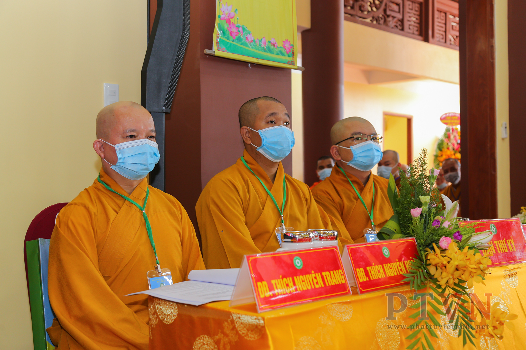 Mở đầu buổi lễ, chư tôn đức cùng toàn thể quý đại biểu tiến hành nghi thức chào quốc kỳ, đạo kỳ, phút mặc niệm tưởng niệm đến những bậc tiền bối hữu công, anh hùng liệt sỹ đã hy sinh cho dân tộc và đạo pháp.
