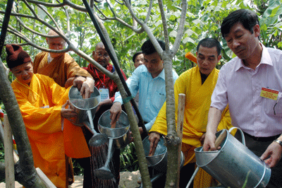 Các đại biểu trồng cây lưu niệm tại vườn trúc chùa Hoa Yên