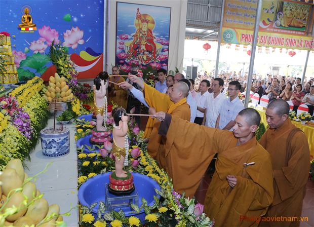 Ngày hôm nay, sự kiện đó được tái hiện lại tại lễ đài chùa Bình Định, giây phút thiêng liêng và mong đợi nhất của mọi người con Phật, đó là khoảnh khắc được lấy nước chiên đàn tắm lên kim thân của Đức Từ Phụ.