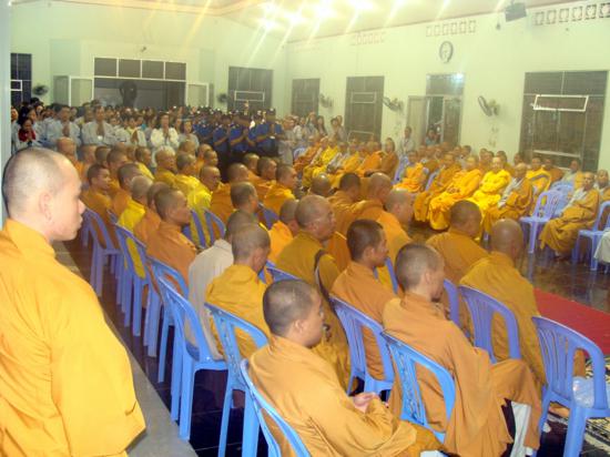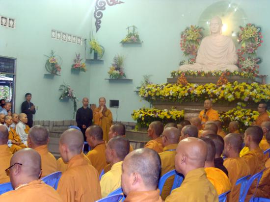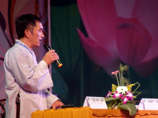 Mở đầu chương trình, Ban Tổ Chức hướng dẫn Phật tử ngồi Thiền 30 phút. Kế đến TT Thích Chân Quang ban Pháp ngữ cho hàng Phật tử với chủ đề NHỮNG TẦNG BẬC TU CHỨNG nhằm tôn vinh, tưởng niệm đến sự đắc đạo của Đức Phật. Đây là nhân lành mà người nào với lòng tôn kính vô biên đối với sự thành đạo của Đức Phật và có ước mơ thiết tha thì đã tự gieo vào cái vòng luân hồi của mình một cái nhân quả của sự đắc đạo không biết lúc nào. Bài Pháp này còn khai tâm cho người tu có một ý niệm rõ ràng về các tầng bậc tu chứng mà một hành giả cần phải trải qua. Từ đó mọi người có sự cảnh tĩnh bằng tâm niệm chỉ có con đường duy nhất người tu phải chọn là cần nổ lực tinh tấn tu hành và biết con đường đi của mình còn rất xa. Đừng tưởng rằng mình tu có được chút ít kết quả tâm linh, có thần thông nào mà đã chứng đạo là đổ vỡ tất cả, không đi đến được cái đích của sự giác ngộ giải thoát.