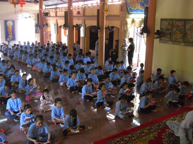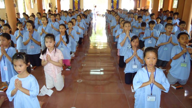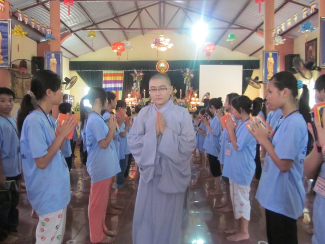 Buổi trưa, với sự thuyết phục và dậy dỗ của quí Thầy trong CLB Hoằng pháp trẻ Thành phố Hồ Chí Minh,các em được sắp xếp đội hình, đọc kinh, Niệm Phật, học hát, và học oai nghi của người con Phật.