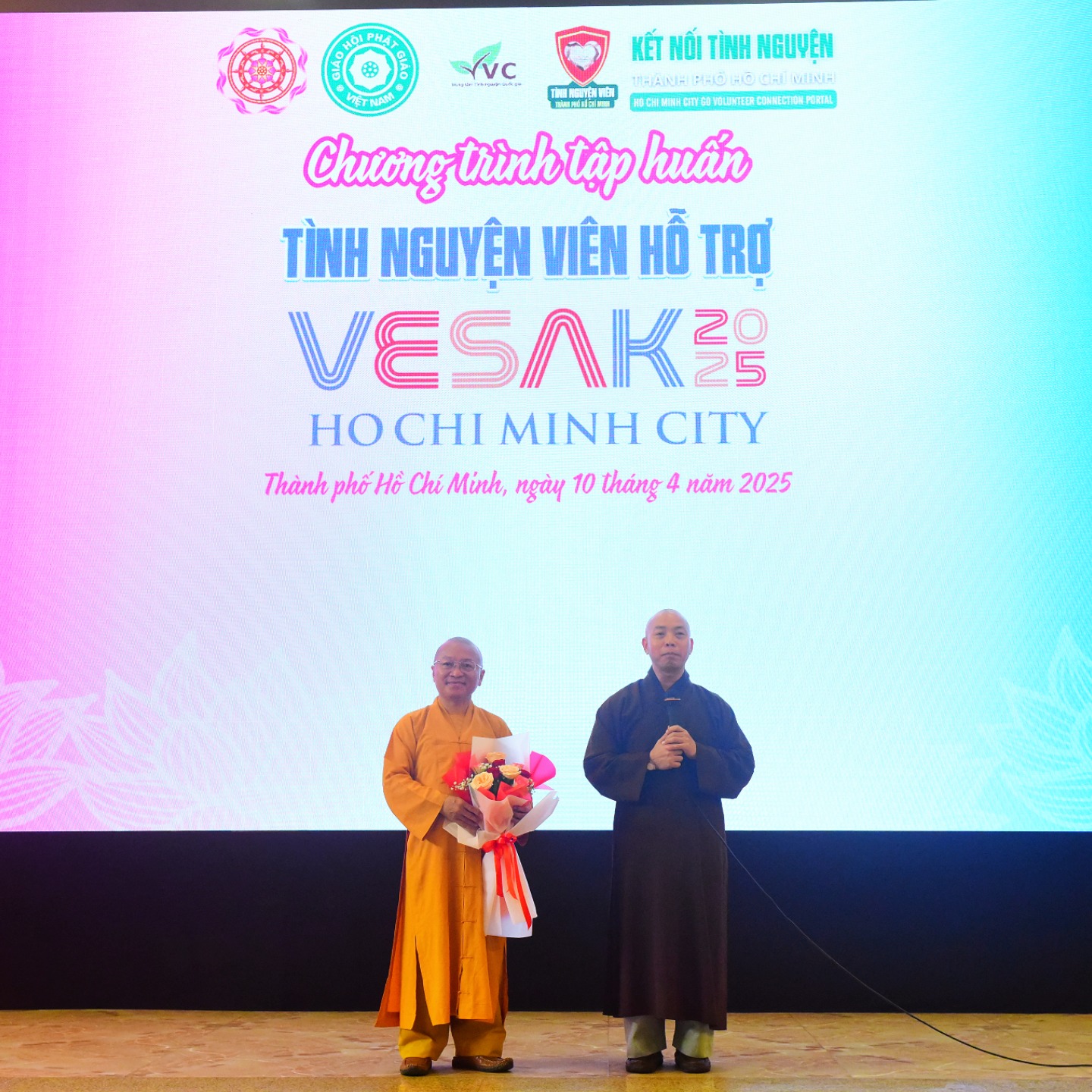 Chứng minh buổi tập huấn có Thượng tọa Thích Nhật Từ, Phó Tổng Thư ký Thường trực Ủy ban Tổ chức Đại lễ Vesak Liên Hiệp Quốc 2025; Thượng tọa Thích Quang Thạnh, Phó Tổng Thư ký kiêm Trưởng ban Điều phối tình nguyện viên Đại lễ Vesak Liên Hiệp Quốc 2025; Thượng tọa Thích Tâm Hải, Ủy viên Thư ký Ủy ban Tổ chức Đại lễ Vesak Liên Hiệp Quốc 2025.