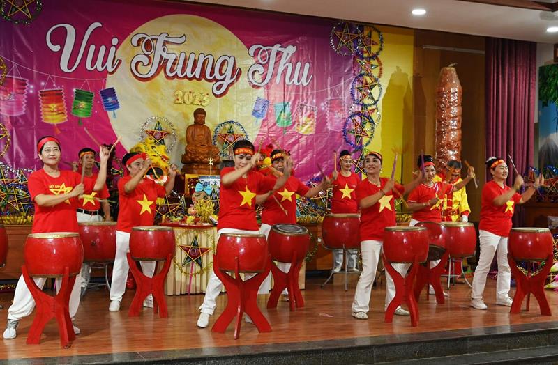 Tại đêm hội Vui trung thu các em bé được thưởng thức một màn trống hội và các điệu múa dân gian do các Phật tử Câu lạc bộ Cựu chiến binh Phật tử, Câu lạc bộ Phật tử Hoan hỉ và Câu lạc bộ Thanh thiếu niên Phật tử Quán Sứ trình diễn trong không khí rộn ràng tươi vui.