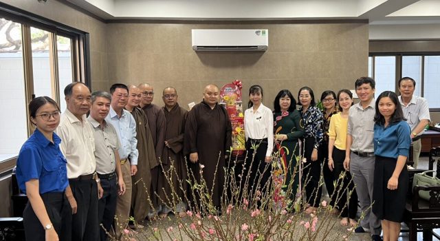 Thượng tọa Thích Trung Nguyện – Phó Chánh Thư ký kiêm Chánh Văn phòng BTS GHPGVN TP cùng chư tôn đức Phó văn phòng BTS GHPGVN thân mật tiếp đoàn.