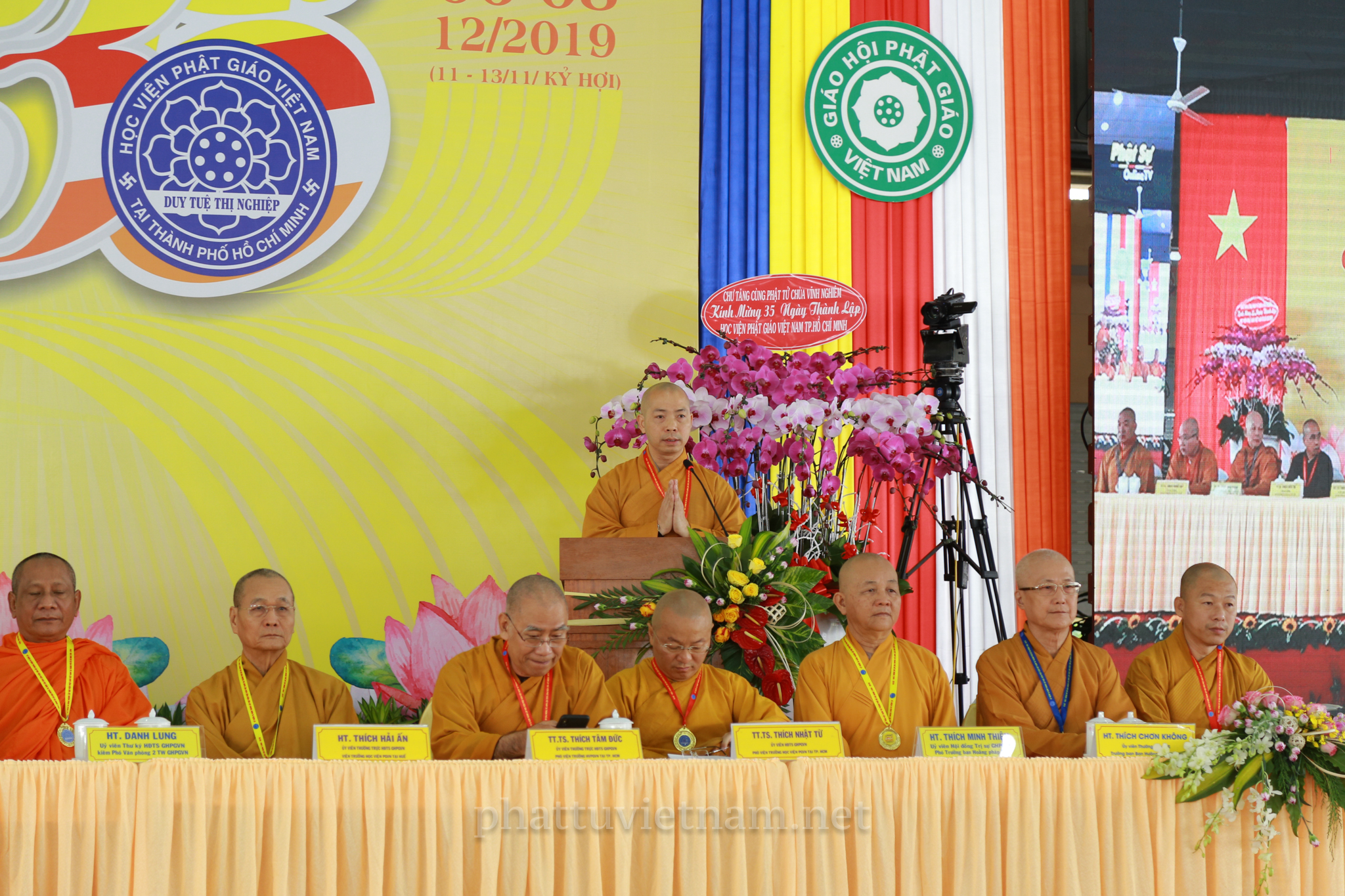 Mở đầu buổi lễ, HT.Thích Giác Toàn – Phó Viện trưởng Học Viện Phật Giáo Việt Nam phát biểu khai mạc Hội thảo. Hòa thượng cho biết, BTC Hội thảo đã nhận được hơn 140 bài nghiên cứu của chư tôn đức, quý học giả tri thức từ các nơi gởi về, trong đó có 134 bài nghiên cứu có nội dung phù hợp với chủ đề. Mục đích của hội thảo lần này là cùng hướng đến ý nghĩa cao thượng của giáo dục Phật giáo là giáo hóa con người, là chuyển hóa khổ đau, ứng dụng giáo dục phật giáo vào giáo dục xã hội, chặn đứng các vấn nạn xã hội hiện nay. Hòa thượng cũng tri ân đến quý chư tôn đức, học giả tri thức gửi bài tham dự, và đến tham gia hội thảo khoa học lần này.