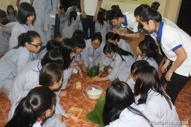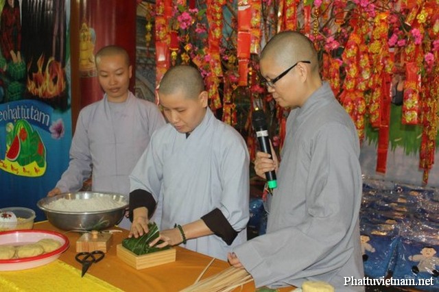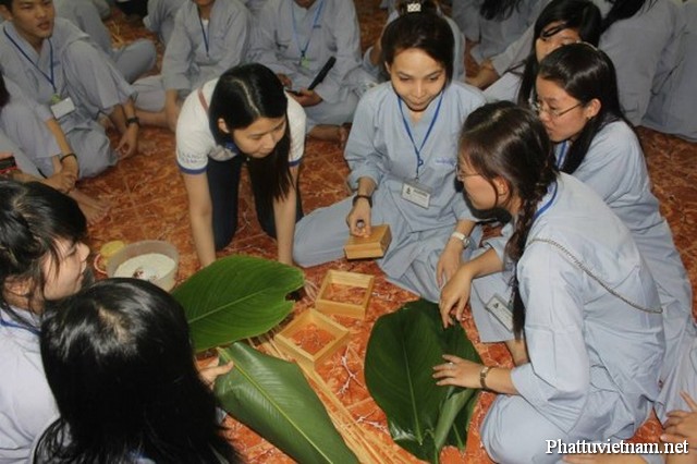 Một phần hết sức đặc biệt trong chương trình khóa tu “Sắc Xuân” lần này là các bạn tu sinh được học cách gói bánh chưng do Sư cô Huệ Đức và Sư cô Diệu Quang hướng dẫn. Sau khi chú ý theo dõi phần hướng dẫn cách làm bánh của hai Sư cô, các bạn tu sinh được chia nhóm để thi gói bánh chưng.