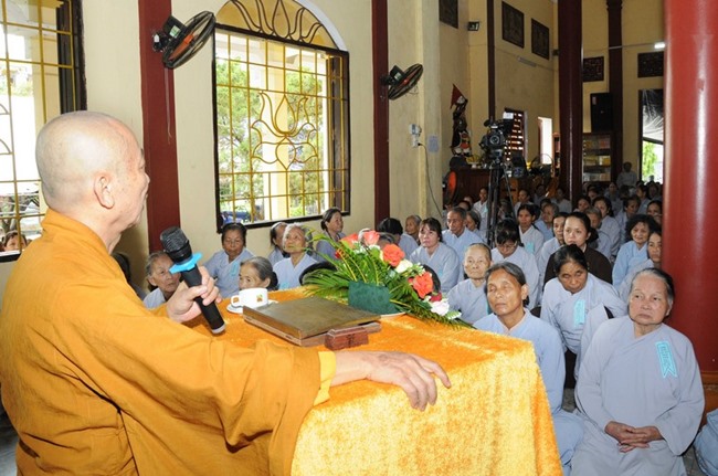 Sau khi tác lễ truyền giới xong, TT.Thích Phước Chấn, trụ trì chùa Hòa An (TP.Tam Kỳ) đăng tòa thuyết Pháp cho toàn thể hội chúng.