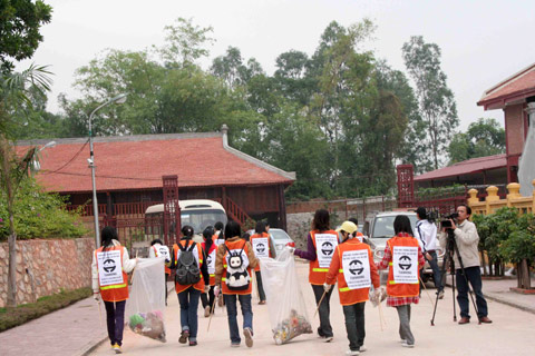 Các sinh viên trong những bộ đồng phục màu da cam, trên lưng mang bảng đề khẩu hiệu “Hãy đừng để lại gì ngoài những dấu chân. Hãy đừng mang theo gì ngoài những bức ảnh”, họ đi nhặt những cộng rác, thu dọn và chỉnh trang lại khuôn viên chùa.
