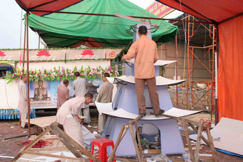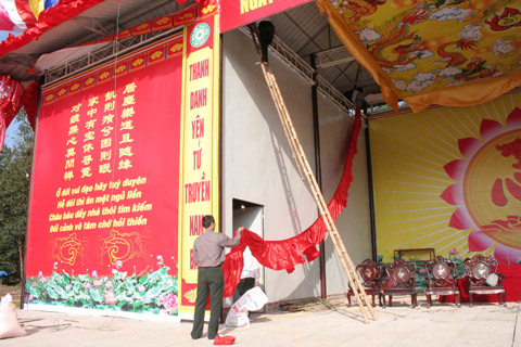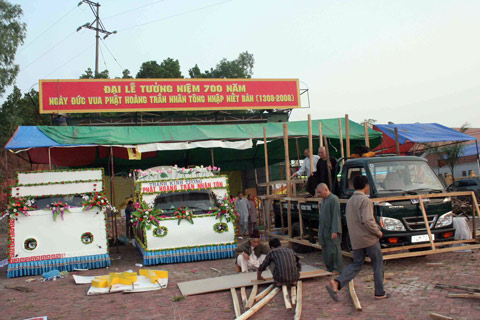 Những chiếc xe hoa trang trí sự tích Phật hoàng Trần Nhân Tông đang được gấp rút hoàn thiện. Trong số những xe hoa này, chúng tôi nhận thấy có một chiếc đặc biệt – xe hoa của Phật giáo Nam Tông Khmer, trang trí hình hai con rồng chầu hai bên, phía trường có tượng Đức Phật nhập thiền định, phía sau là ngôi chùa Khmer được làm công phu có hình đức vua Trần Nhân Tông tọa thiền.