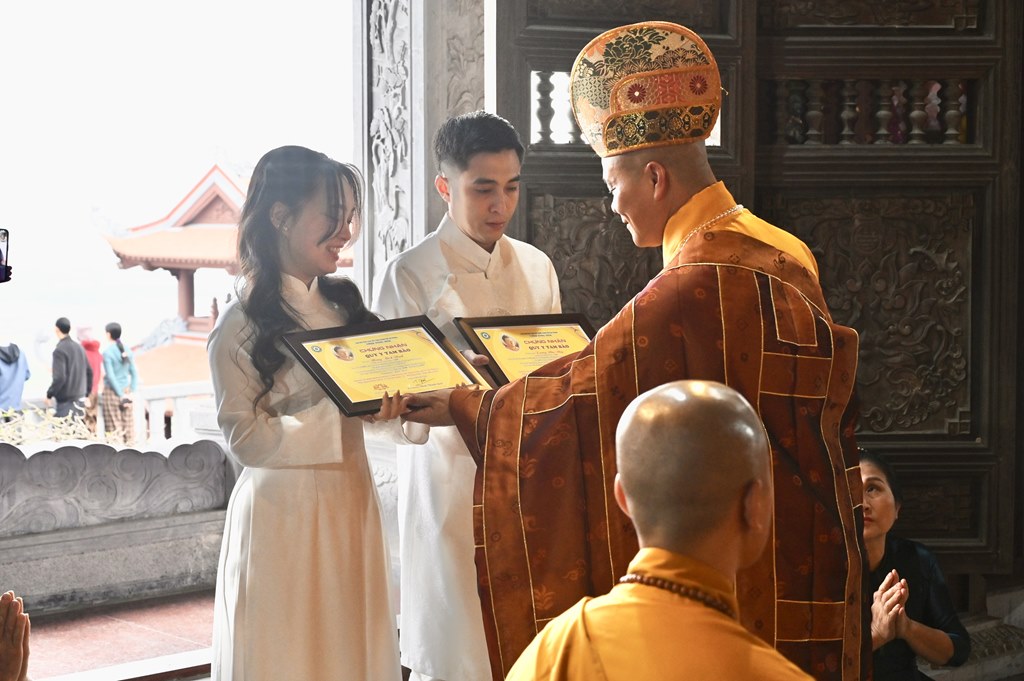 Đôi bạn trẻ đón nhận Giấy chứng nhận Lễ Hằng Thuận từ Hòa thượng chứng minh, trưởng Ban tổ chức buổi lễ