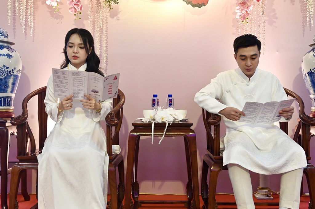Tân Lang và Tân Nương lắng nghe lời chỉ dạy và căn dặn của Hòa thượng chứng minh