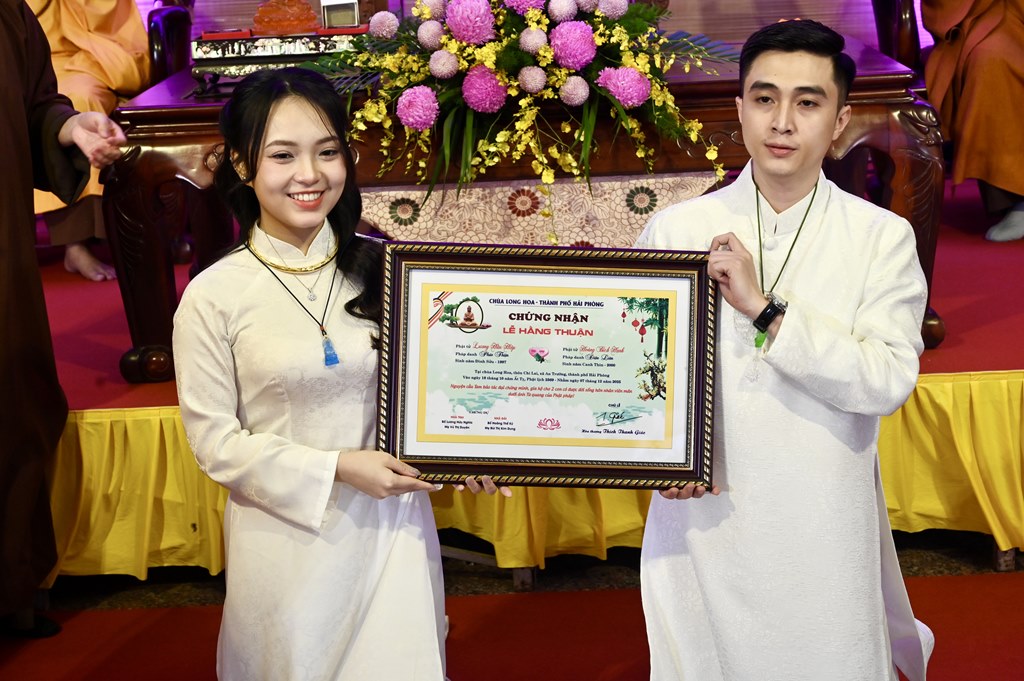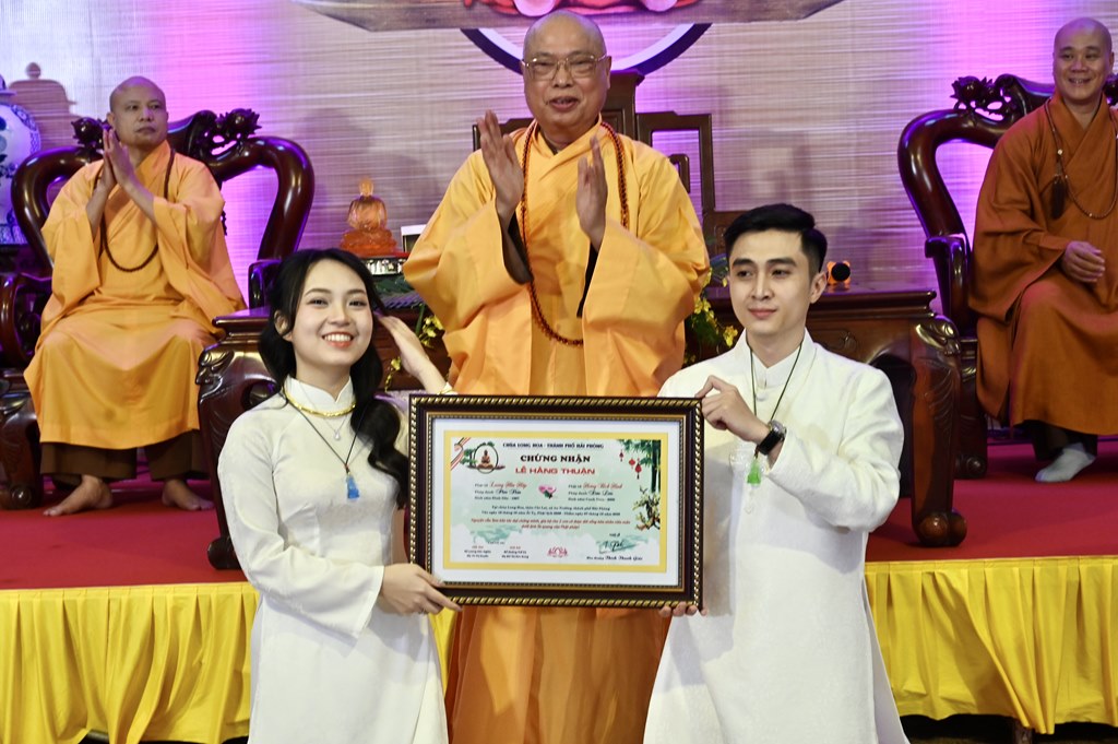 Dịp này, Hòa thượng Thích Thanh Giác – Trụ trì chùa Long Hoa, trưởng BTC buổi lễ đã trao Giấy chứng nhận Lễ Hằng Thuận và trao quà chúc phúc cho đôi bạn trẻ, cũng như những món quà Phật giáo ý nghĩa, chúc mừng đôi tân lang, tân nương kể từ nay đã nên vợ nên chồng và mong cho đôi bạn được “Trăm năm tình viên mãn, bạc đầu nghĩa phu thê”.