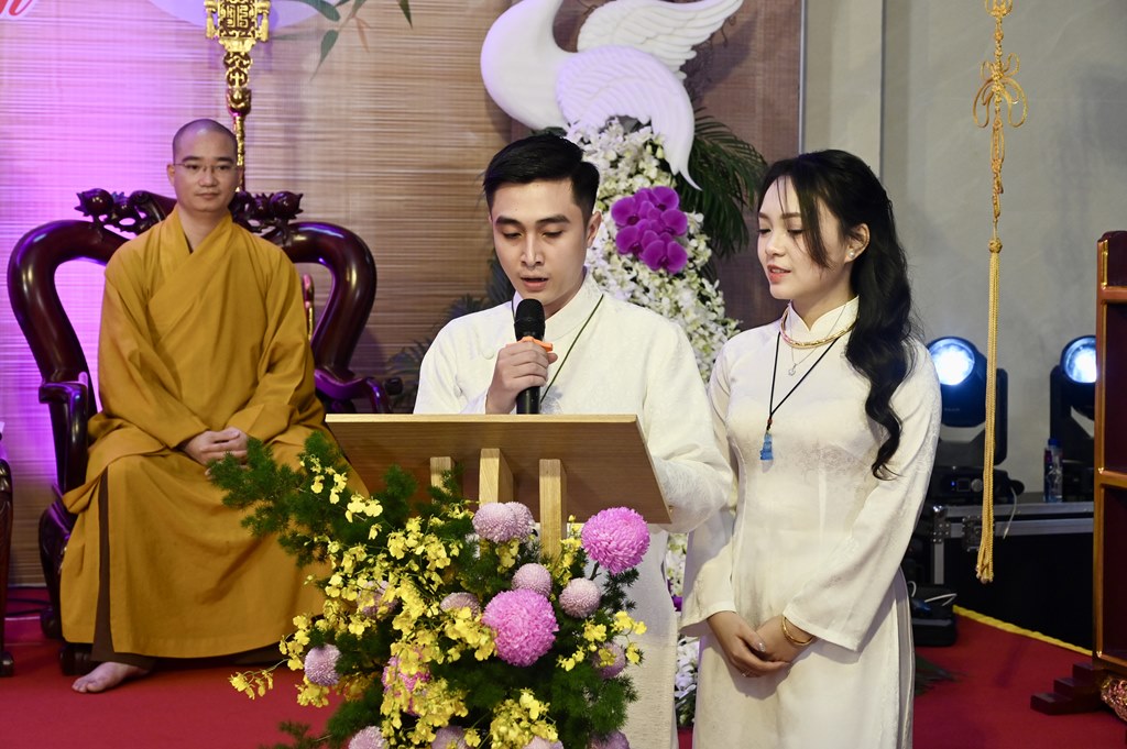 Trước sự chứng minh của chư tôn đức Tăng Ni và sự chứng kiến của đại diện hai bên gia đình, đôi bạn trẻ đã trao nhẫn cưới cho nhau và dâng lời phát nguyện luôn yêu thương nhau, luôn tôn trọng nhau, luôn bảo vệ cho hạnh phúc của gia đình được trường tồn mãi mãi, nguyện sẽ hành trì theo đúng những điều Đức Phật đã chỉ dạy trong kinh Thiện Sinh, đồng thời sẽ cố gắng thực hành, giữ gìn 5 giới của người Phật tử tại gia, nguyện siêng năng, tinh tấn tu học để trở thành những người phật tử chân chính, hộ trì Tam Bảo.