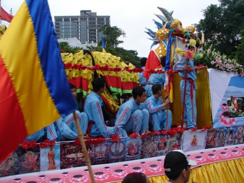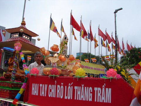 Theo sau xe hoa là dòng xe máy có treo cờ Phật giáo hộ tống.