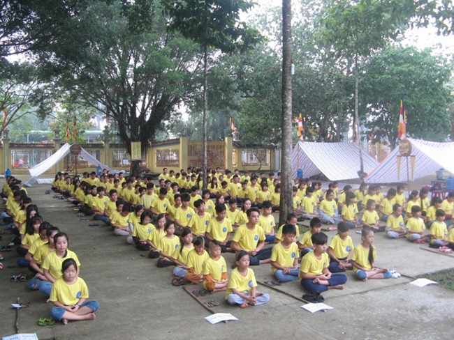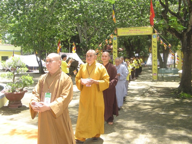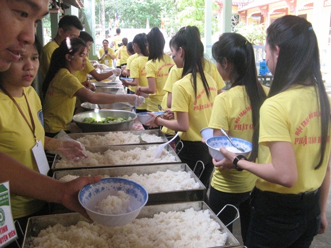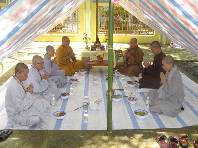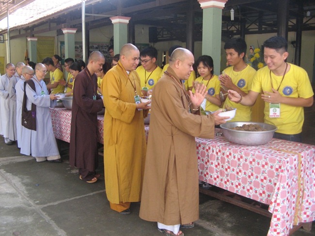 Cùng nhau ôm bát chậm rãi đi dưới những tán cây tỏa bóng mát để tái hiện hình ảnh Đức Phật Thích Ca cùng tăng đoàn đi khất thực vào hơn hai thiên niên kỷ trước, rồi tập dùng cơm trong chánh niệm dưới mái lều với bạn đồng tu. Trại sinh cảm thấy thư thái, thanh tịnh khi nhai từng thìa cơm chay mà quí đạo hữu bỏ công nấu nướng, chế biến để có bữa ăn ngon nhất. Trong tiếng niệm Phật kinh hành “Nam mô A Di Đà Phật” sau khi thọ trai, từng bước, từng bước, tâm hồn không một chút vướng bận riêng tư, mọi lo toan đời thường, mọi nhọc nhằn như tan biến, “Thong dong tự tại, rứa mà vui”.