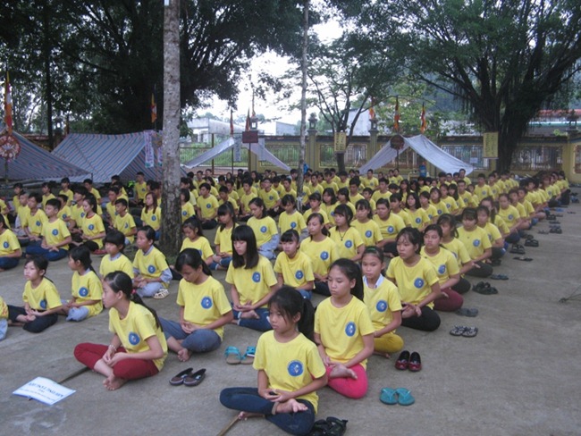 Hiệu lệnh báo thức vang lên, 5 giờ 15 phút, khi bầu trời phía đông hé sáng thì trại sinh đã hàng ngũ ngay ngắn chuẩn bị tọa thiền do ĐĐ T. Như Dũng hướng dẫn. Nhìn những khuôn mặt vô tư tọa thiền dưới ánh bình minh trong tiếng chim ríu rít, nhày nhót chuyền cành chúng ta liên tưởng đến một thế giới an lành. Sân chùa hôm qua náo nhiệt bao nhiêu thì sáng nay bỗng thanh tịnh bấy nhiêu, chỉ còn nghe tiếng hơi thở của các thiền sinh. Có lẽ đây là hình ảnh đẹp nhất trong hai ngày trại. Xả thiền, thư giãn, đi dưởi những hàng cây chim hót líu lo thật bình yên, rồi thể dục theo nhạc để chuẩn bị cho những hoạt động cuối cùng của hội trại