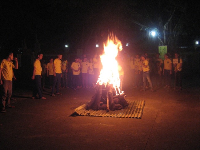 Màn đêm buông xuống, hàng trăm con tim háo hức chờ đợi ngọn lửa thiêng bùng cháy. “Nổi lửa lên xua tan đêm đen, nổi lửa lên xua tan ngăn cách…” Đêm lửa trại bắt đầu cũng là lúc lửa trong tim từng trại sinh bùng cháy. Nắm tay nhau bên ngọn lửa hồng, hát vang những bài ca sôi nổi, quên hết mình là ai, nơi này và đêm nay chỉ có tình đồng loại, không phân chia giai cấp, sang hèn. Mái chùa Pháp Quang uy nghiêm sừng sững chứng kiến một thế hệ tương lai với lửa sống dạt dào đang bừng cháy. Mấy chú tiều mồ côi, dễ thương của Tịnh xá Bửu Sơn mau chóng hòa nhập cùng tập thể nắm tay nhau quây quần bên lửa trại. Cuộc thi “Gương mặt không quen” đã làm cho đêm lữa trại thêm phong phú bằng những lời ca, điệu nhảy ngộ nghĩnh. Lửa đêm nay tan nhưng lửa thiêng vẫn cháy trong lòng mọi người.