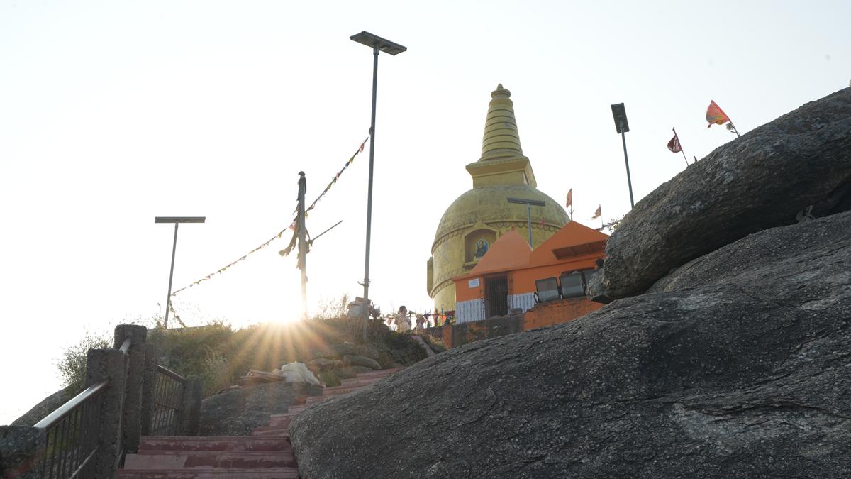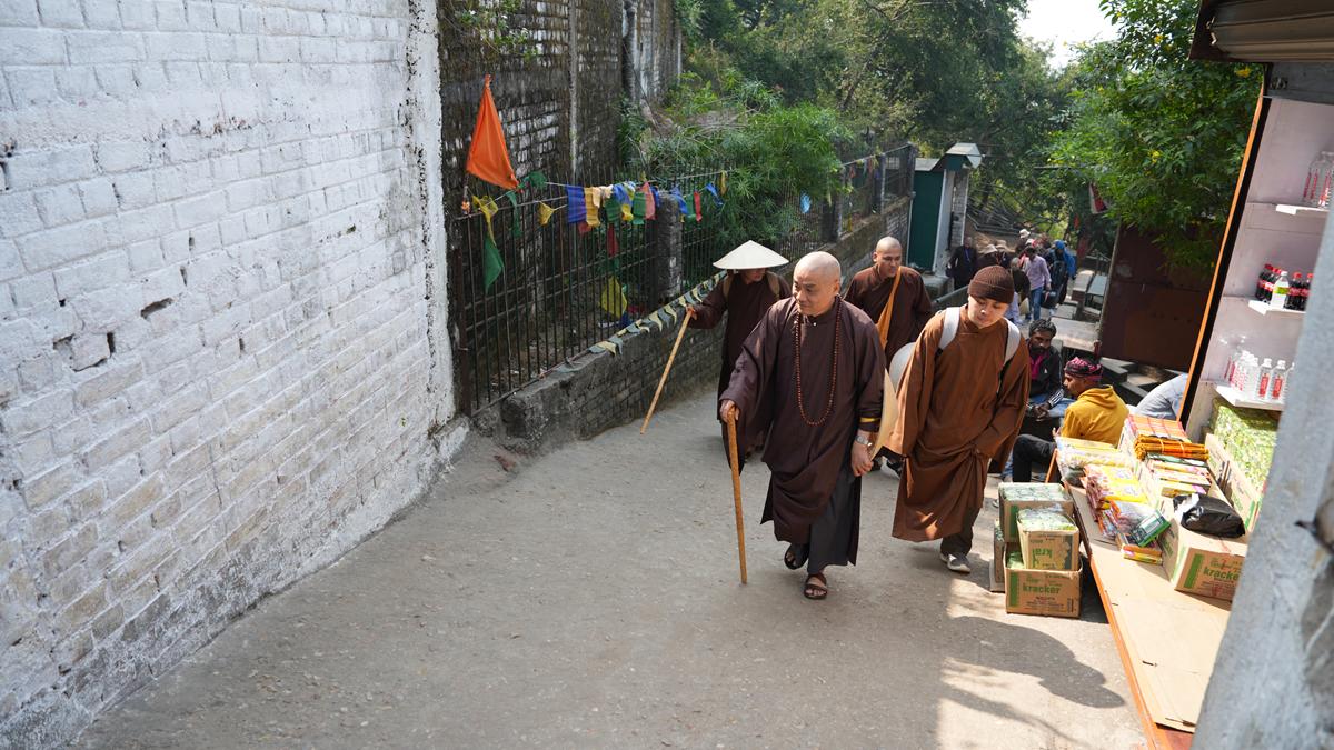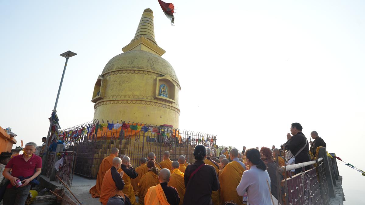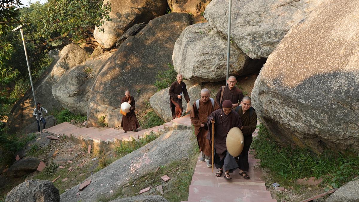 Buổi sáng ngày 13/11, đoàn đã đến Kê Túc Sơn (Kukkutapāda) – ngọn núi thiêng thuộc bang Bihar (Ấn Độ), nơi Tôn giả Đại Ca Diếp, vị Thượng thủ đầu đà, được Đức Phật trao y pháp và đã dùng thần thông tách đôi ngọn núi để vào nhập định, chờ đến khi Đức Phật Di Lặc ra đời mà trao lại y pháp, tiếp nối mạch nguồn Giác ngộ. Con đường lên núi gập ghềnh, đá sỏi sắc cạnh, nhiều đoạn dựng đứng khiến từng hơi thở trở nên nặng nhọc. Nhưng chính trong sự mệt nhọc ấy, Tăng Ni sinh như cảm nhận rõ hơn: để hộ trì Phật pháp, chư Thánh Tăng đã “đổ mồ hôi trong vô số kiếp”.