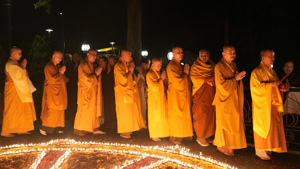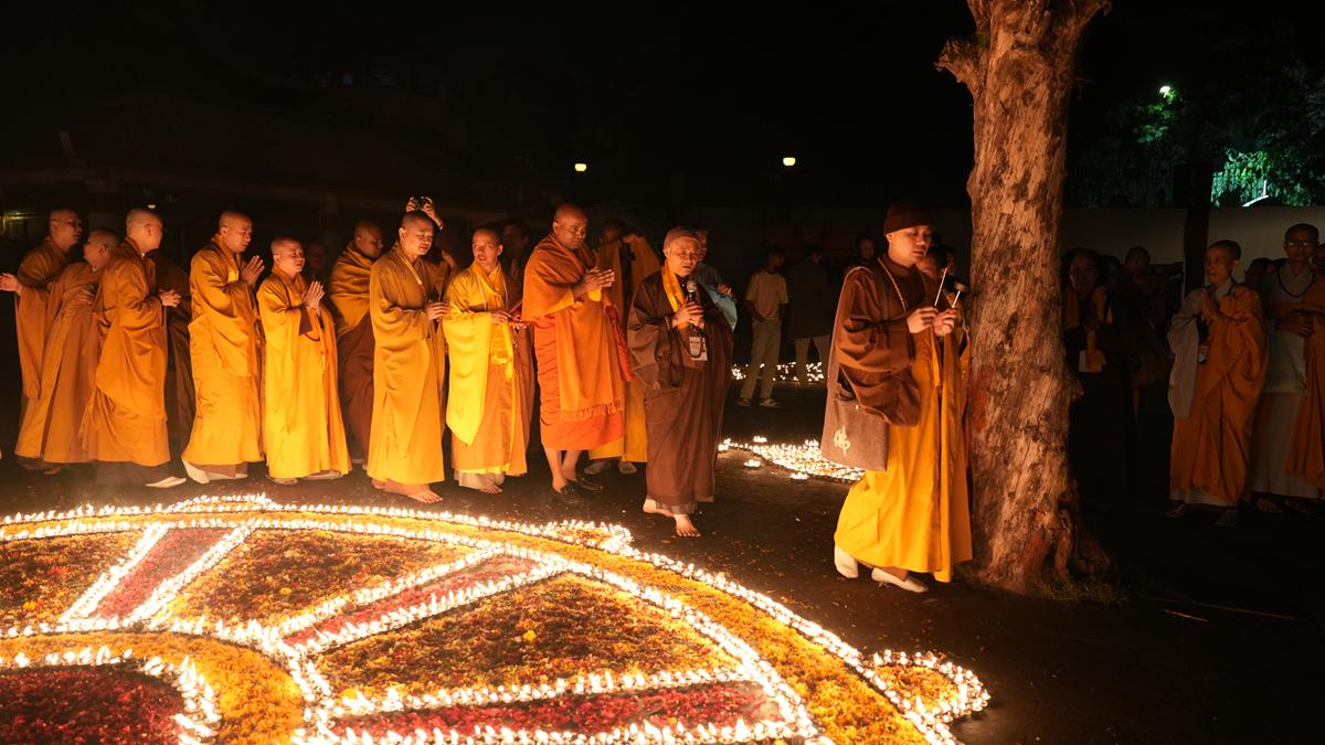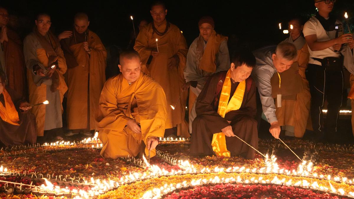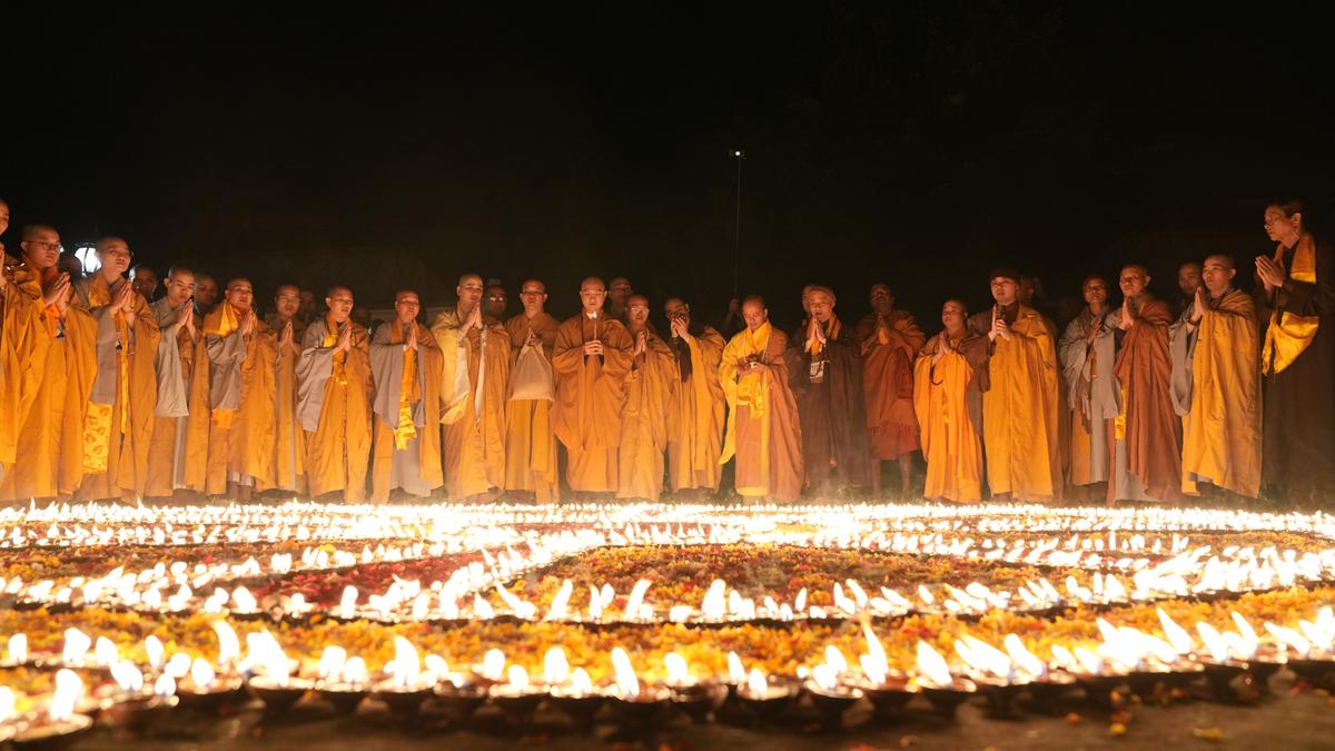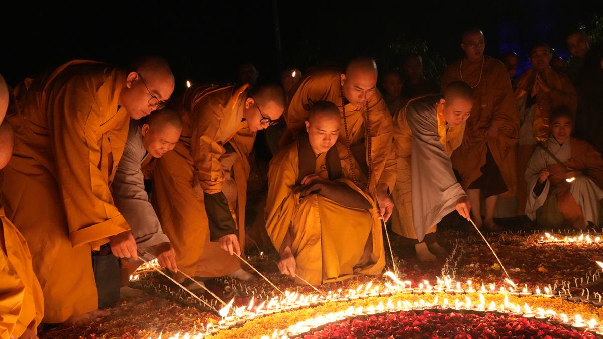 Ánh sáng từ hàng trăm ngọn nến nơi đất Bồ Đề lung linh soi rọi trong đêm, như biểu tượng cho trí tuệ Giác ngộ được thắp sáng từ nội tâm mỗi hành giả.