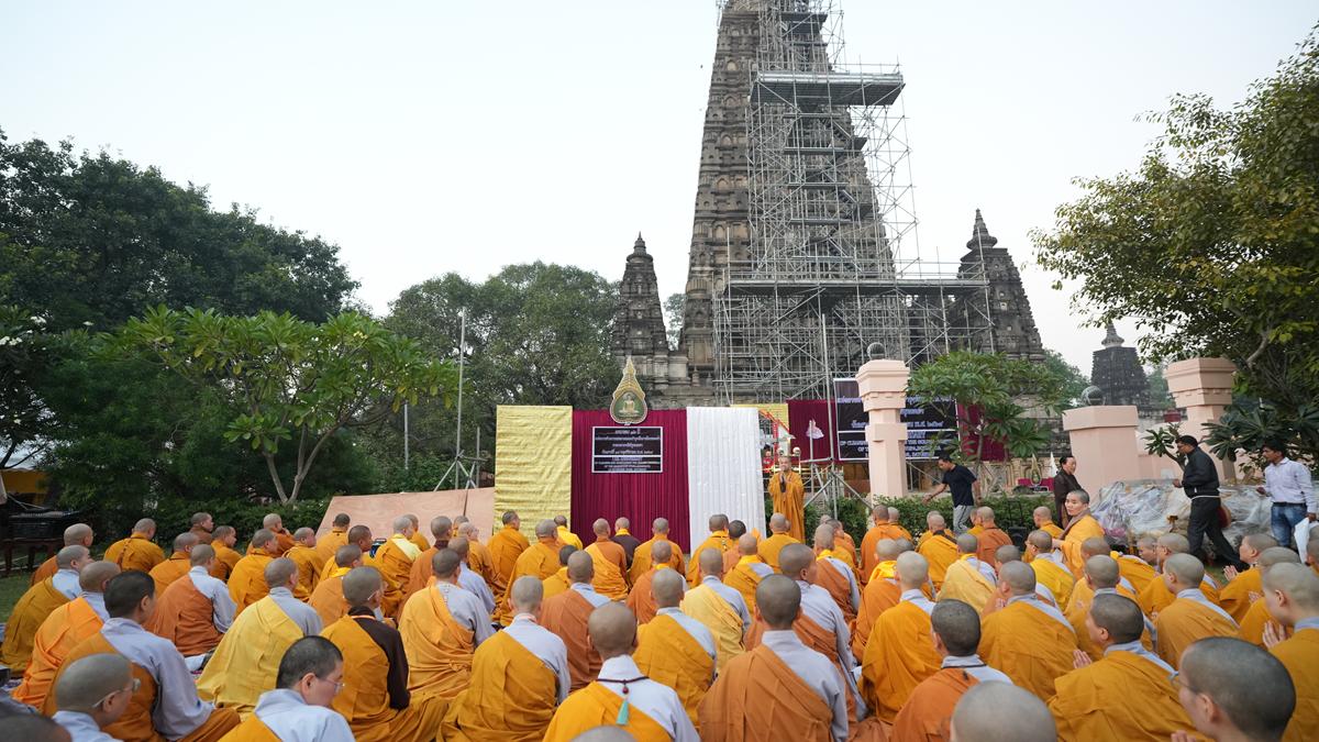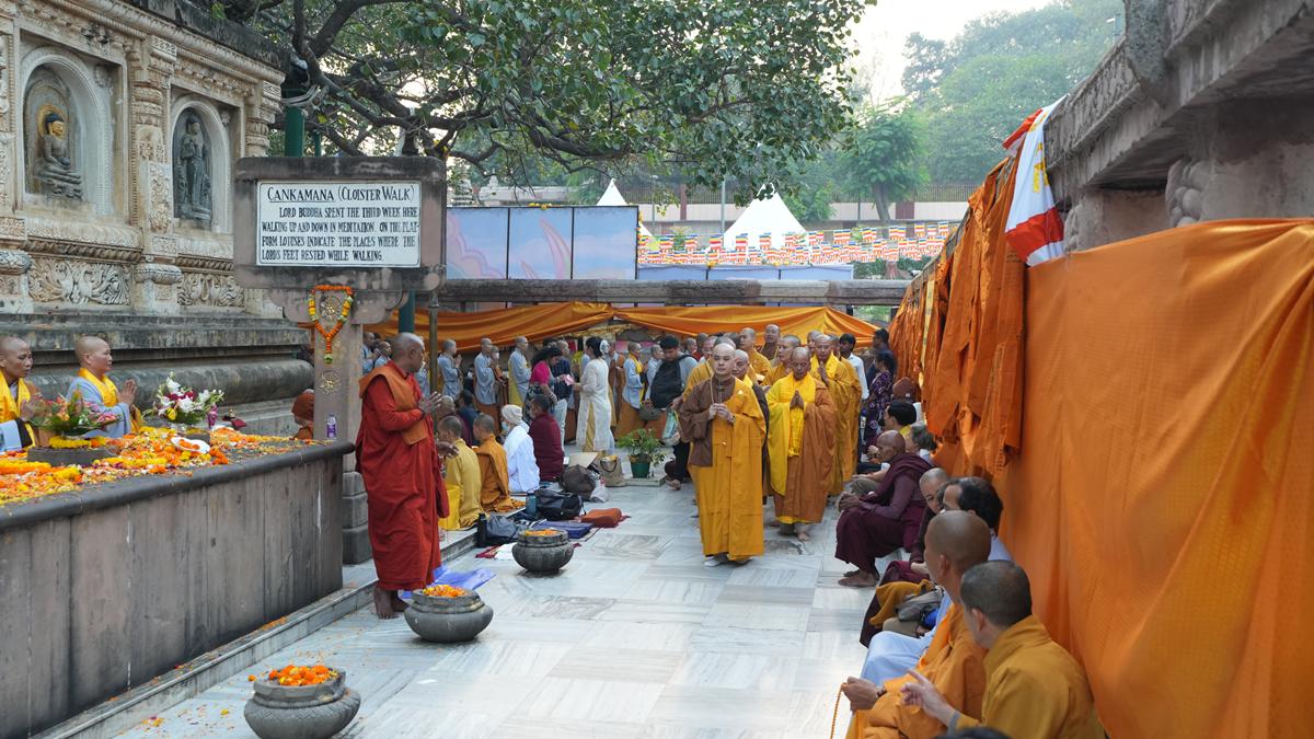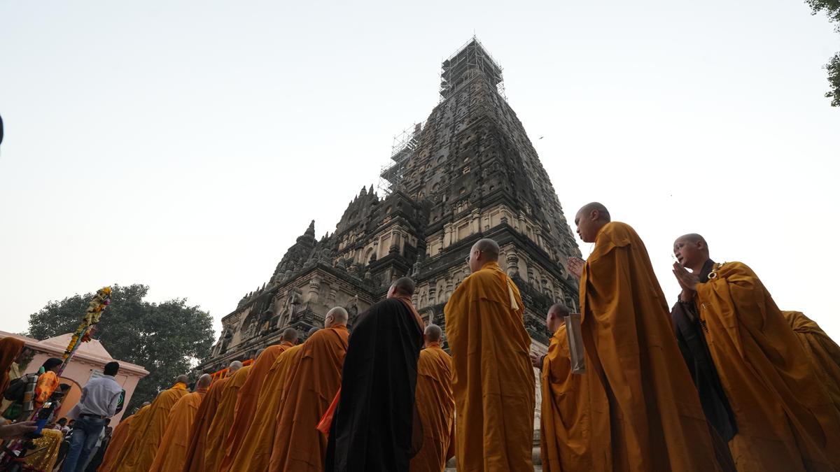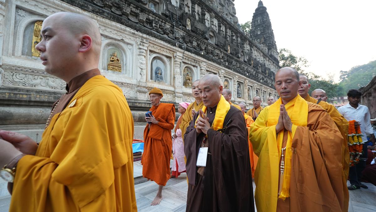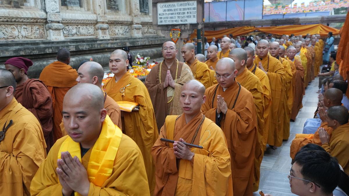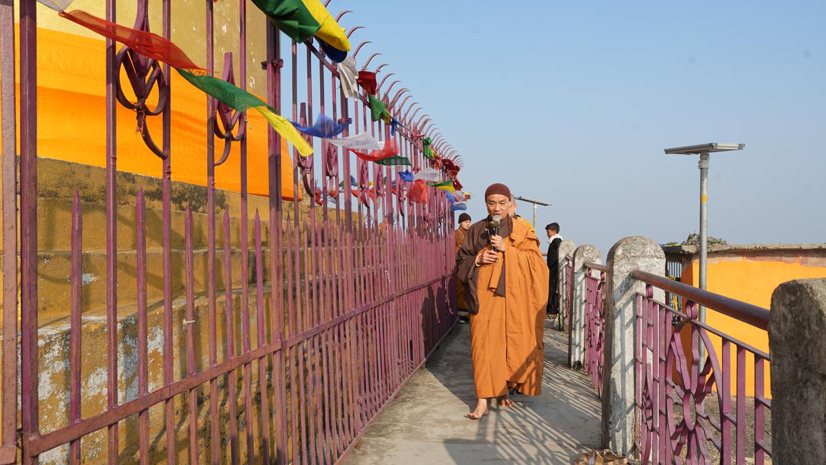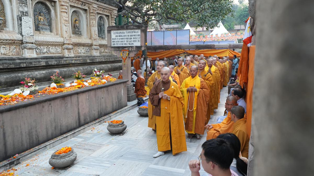 Sau khi thực hiện nghi thức niêm hương và làm lễ Dâng y cúng Phật trong lòng Đại Bảo tháp, đại chúng trang nghiêm thiền hành nhiễu tháp trong tiếng niệm Phật âm vang Thánh địa, như một sự quy kính thầm lặng nhưng sâu xa, xoay quanh trục tâm linh nơi Đức Phật đã giác ngộ. Tại sân trước Đại Bảo tháp Mahabodhi, Thượng tọa Thích Tiến Đạt đã cùng đại chúng ôn lại sự kiện Đức Phật thành đạo Vô thượng Bồ Đề, đồng thời giảng giải về ý nghĩa thâm sâu của con đường chứng ngộ: một tiến trình tuần tự từ tự độ đến độ tha, từ tự hành đến giác tha, kết tinh trọn vẹn trí tuệ, từ bi và định lực. Đó cũng chính là lộ trình mà mỗi hành giả đều phải bước đi trên con đường trở về với chính mình.