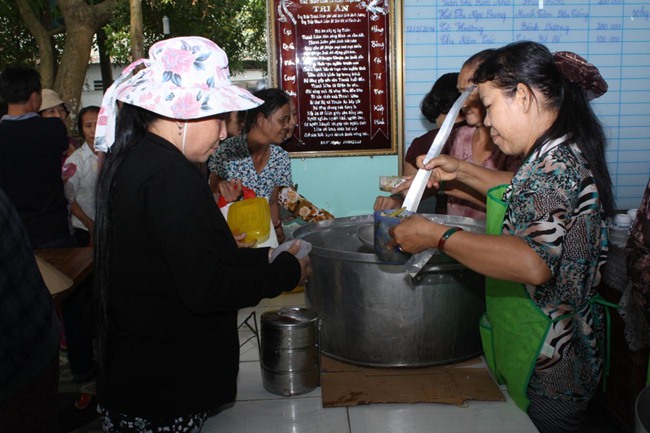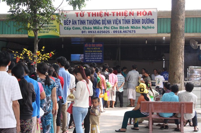 Hơn 10 giờ trưa, Bếp ăn từ thiện tại BVĐK tỉnh Bình Dương có khá đông bệnh nhân và người nhà của họ xếp thành hai hàng dài để nhận những phần cơm chay miễn phí. Bộ phận phục vụ làm việc không ngưng tay, mồ hôi ướt áo nhưng ai cũng tươi cười. Các dãy ghế phía trước được bố trí ngay ngắn, sạch sẽ.