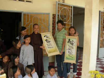 Chị Mai, một nhân viên của công ty đã có ý tặng riêng cho nhà chùa 1 bức tranh Phật Thích Ca thật đẹp, 1 phong bì và một quyển sách “Phật giáo với nhân sinh” .