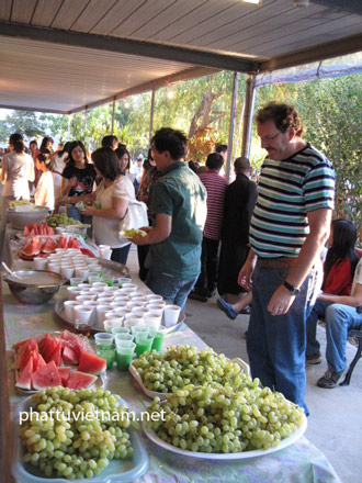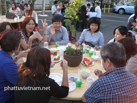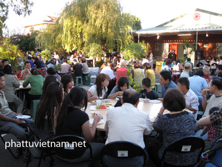 Đúng 7g ngày 21-2, lúc thời tiết dịu mát, tiệc chay tình thương đã khai mạc. Có đông đảo những khách Tây và đồng hương đến ủng hộ buổi tiệc chay. Ngoài việc tín chúng hoan hỷ đến chùa để công quả nấu nướng, chuẩn bị các món ăn thuần túy Việt nam như mỳ xào, chả dò chiên chay, lơ-gu, bánh phồng, trái cây… đến việc sắp xếp bàn ghế, dọn dẹp- trang trí sân vườn thoáng mát, ai nấy cũng tán thán cách phục vụ tận tình và chu đáo, không khí buổi tiệc thật ấn tượng.