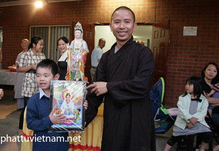 Thầy trú trì trao quà cho giải Đặc biệt là tượng Phật Quán Thế Âm