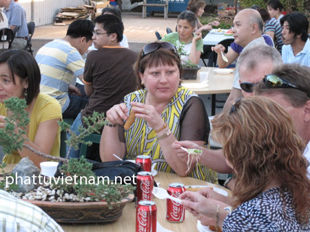 Trong chùa, khách Tây đến sớm và ngồi chờ, phật tử đến lễ Phật ở chánh điện và nói cho khách Tây biết nơi nào lạy Phật, chỗ nào lấy thức ăn. Khi lấy hết đồ ăn, thấy đồ ăn gần hết, khách Tây còn chạy vào trong bếp để lấy đồ ăn tiếp. Hỏi họ ăn uống có được không, họ nói họ khen là hấp dẫn, ngoài sân thì con nít chạy lòng vòng”, sư chú Đồng Hòa kể.