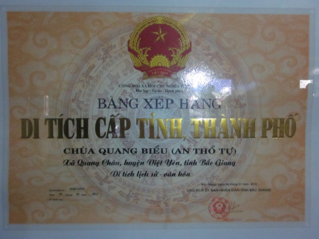 Vào sáng ngày 05 tháng 04 nam 2012 (tức ngày 15 tháng 03 âm lịch) tại lễ hội chùa Quang Biểu, làng Quang Biểu, xã Quảng Châu, huyện Việt Yên, tỉnh Bắc Giang. Chính quyền và nhân dân làng Quang Biểu đã tổ chức lễ đón nhận và rước bằng di tích lịch sử văn hoá xếp hạng: di tích cấp tỉnh cho chùa Quang Biểu (An thổ tự), do UBND xã Quang Châu thay mặt cho UBND tỉnh Bắc Giang trao nhận.