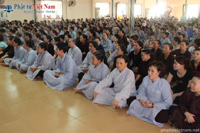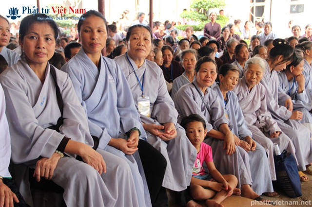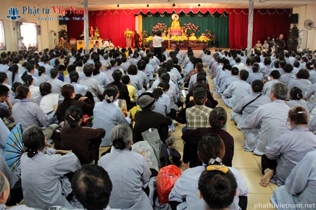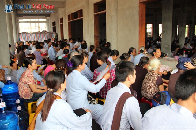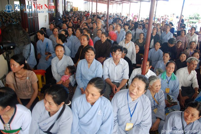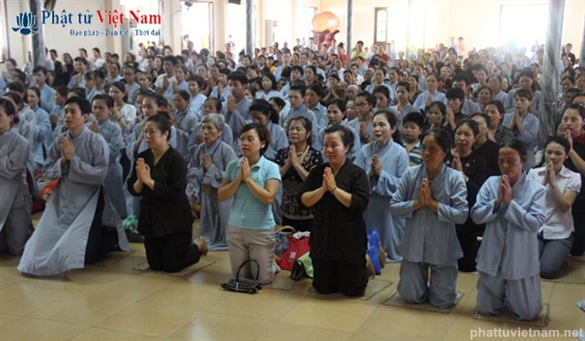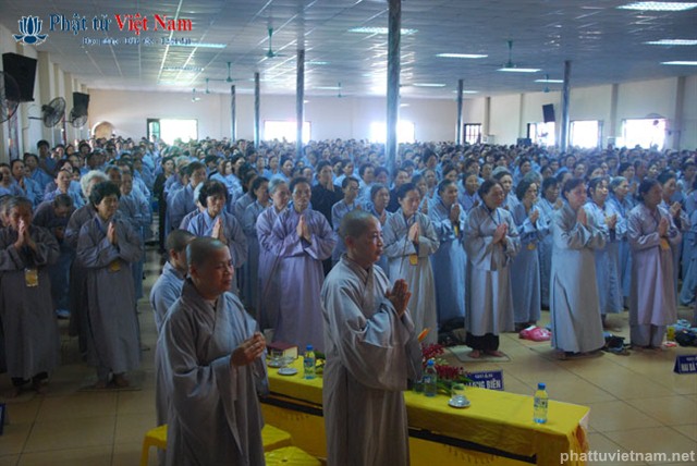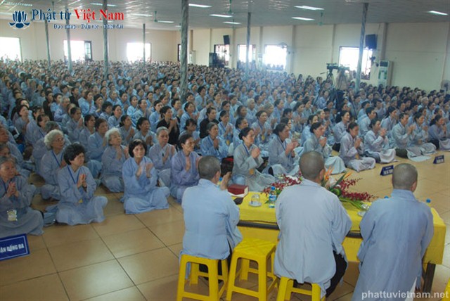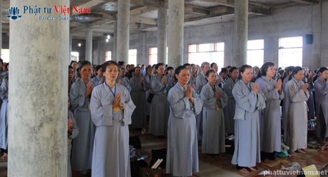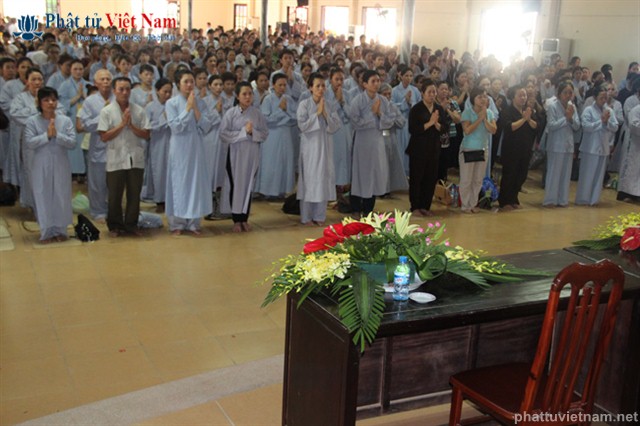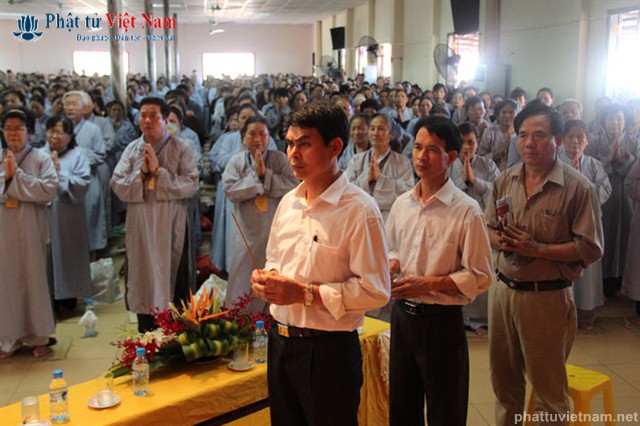 Tiếp đó vào buổi chiều, đúng 13 giờ 30, quý Phật tử về dự lễ đã được quý Thầy làm lễ quy y Tam Bảo thọ trì Tam quy ngũ giới.