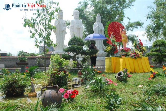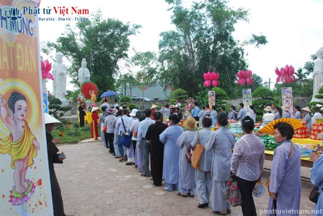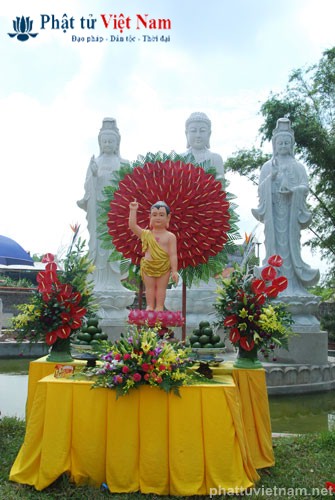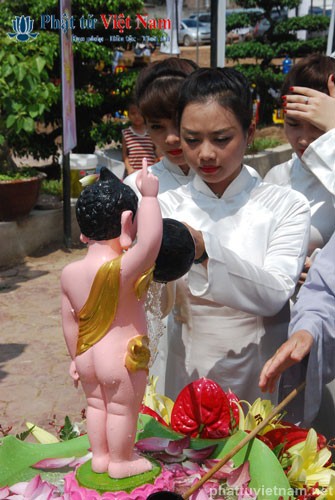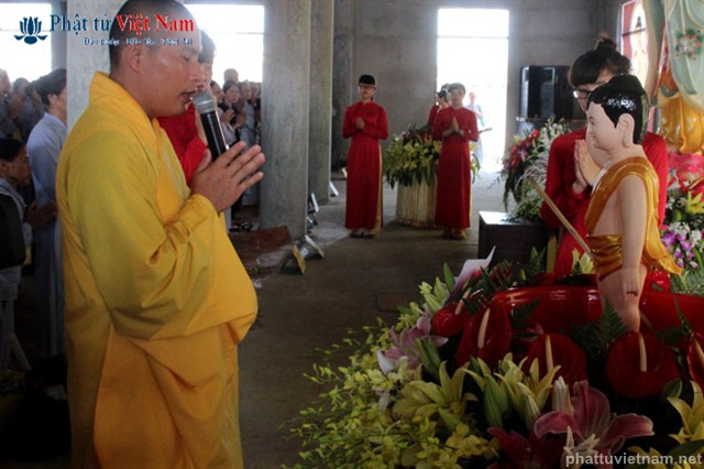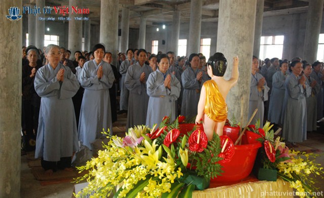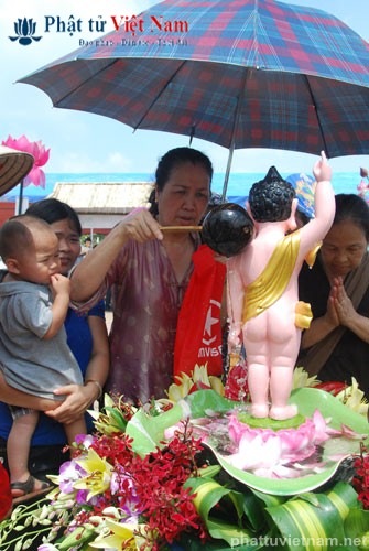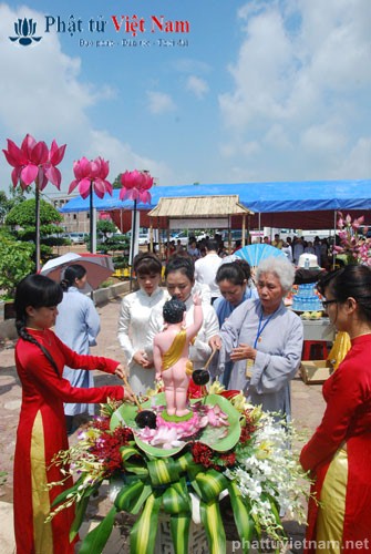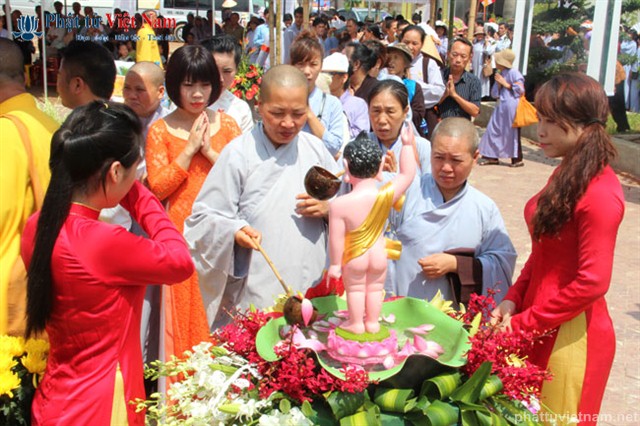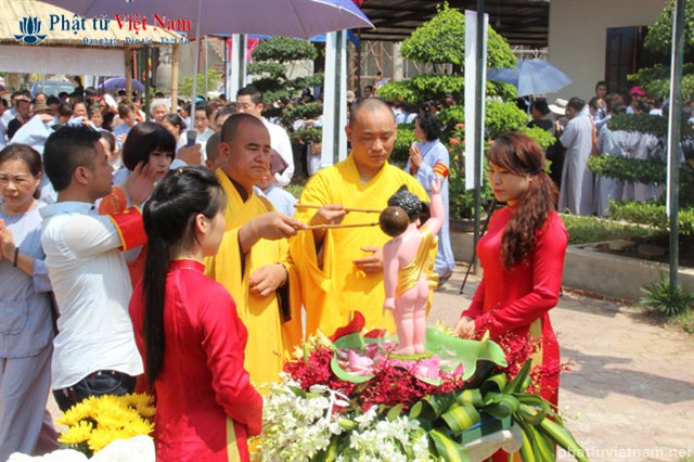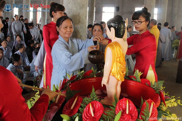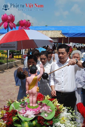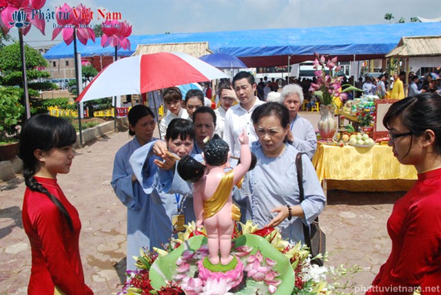 Đúng 8 giờ buổi lễ được chính thức bắt đầu. Ngay sau phần nghi thức hành chính là phần nghi lễ Tắm Phật. Quý Phật tử đã được BTC sắp xếp thành 2 khu vực: Quý Phật tử ngồi dự lễ tại giảng đường và khu vực hai bên cánh gà của giảng đường sẽ cùng quý thầy bước đến hồ Tam Thánh nơi có tôn tượng Phật đản sinh để cử hành nghi lễ Tắm Phật; quý Phật tử dự lễ ở tầng trệt của ngôi chánh điện sẽ cùng quý thầy làm lễ Tắm Phật ngay tại ngôi đại hùng bảo điện (hiện đang được dốc sức hoàn thành).
