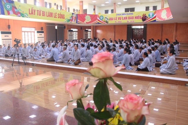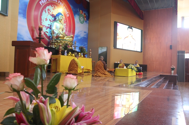 Sau đó đại chúng được lắng nghe pháp thoại của Đại đức Thích Tâm Quán- trụ trì chùa Diên Quang. Trong bài pháp thoại Thầy đã chia sẻ sâu sắc về sự quay về” Tìm lại chính mình” và “Buông bỏ “ mọi ý niệm, sự dính mắc đến chức danh,cái tôi, cái bản ngã của mỗi con người. Thầy đã hướng dẫn hành giả tu tập về sự buông bỏ mọi công việc, lo lắng trong lòng của mình. Không phải bỏ hết tất cả như: công việc, gia đình,…. Sự buông bỏ Thầy muốn nhắn nhủ chia sẻ cho Phật tử là buông bỏ cái tôi của mình, đừng suy nghĩ mình là số 1 không có ai có thể có thay thế được mình. Cũng đừng bám chắc vào những cái của tôi, sở hữu của tôi, tự ngã của tôi… Nếu còn thấy mình là một cái gì trong đó thì mình không thể nào có sự bình an thật sự. Tu tập để thấy rõ mọi sự mọi vật trên đời đều do nhân duyên hợp thành một cá nhân nhỏ không thể làm nên được bất cứ một điều gì. Cho nên chúng ta hãy dành thời gian tu tập để chuyển hoá những tâm hành còn lăng xăng trong đầu của mình.