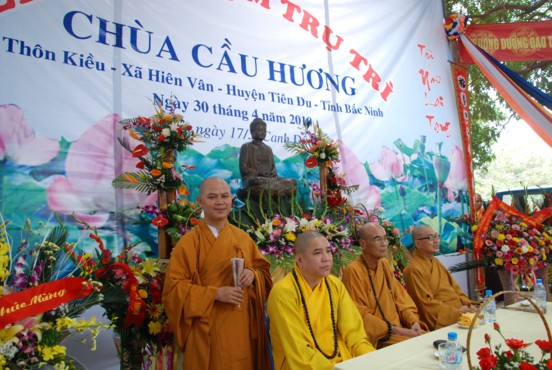 Ông Phạm Đăng Phong – Trưởng Thôn thay mặt ban tổ chức đọc diễn văn khai mạc lễ bổ nhiệm trụ trì, ông giới thiệu lịch sử chùa tồn tại với lịch sử làng Kiều từ giữa thế kỷ 19 đến đầu thế kỷ 20, Ngôi chùa đã qua 2 đời sư Thầy trụ trì , để tỏ lòng tôn kính nhân dân địa phương đã xây tháp tôn thờ.