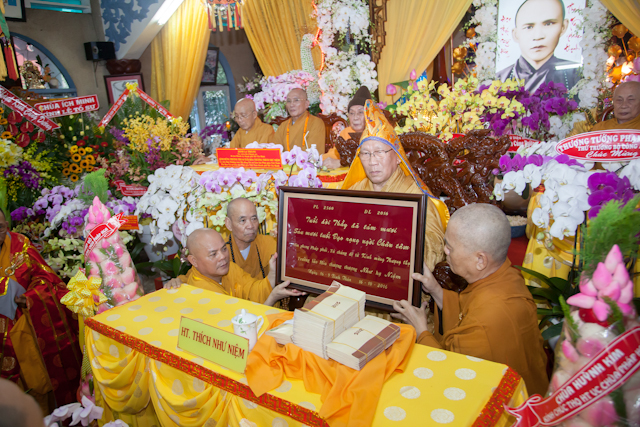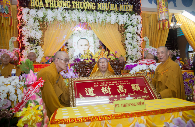 Bắt đầu buổi lễ, Môn đồ đệ tử dâng Pháp y trang nghiêm cúng dường lên ân sư HT.Thích Như Niệm. Tiếp theo, thay mặt Chư tôn đức Ban hoằng pháp T.Ư, Học viên 2 lớp cao trung cấp giảng sư, Môn đồ tứ chúng, HT.Thích Bảo Nghiêm thành kính dâng lời cảm ân sư, chúc mừng khánh tuế Hòa thượng ân sư tròn 80 tuổi đời, 60 tuổi đạo với giới đức trang nghiêm sáng người, bậc thành tựu phạm hạnh, bậc thạch trụ tòng lâm để hàng hậu học nương đức mà tu thân hành thiện, lợi lạc quần sanh.