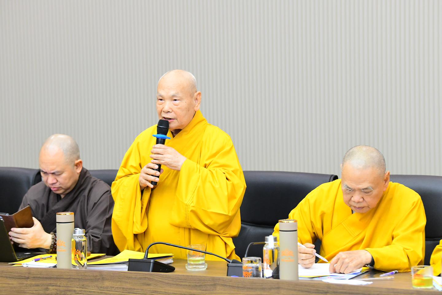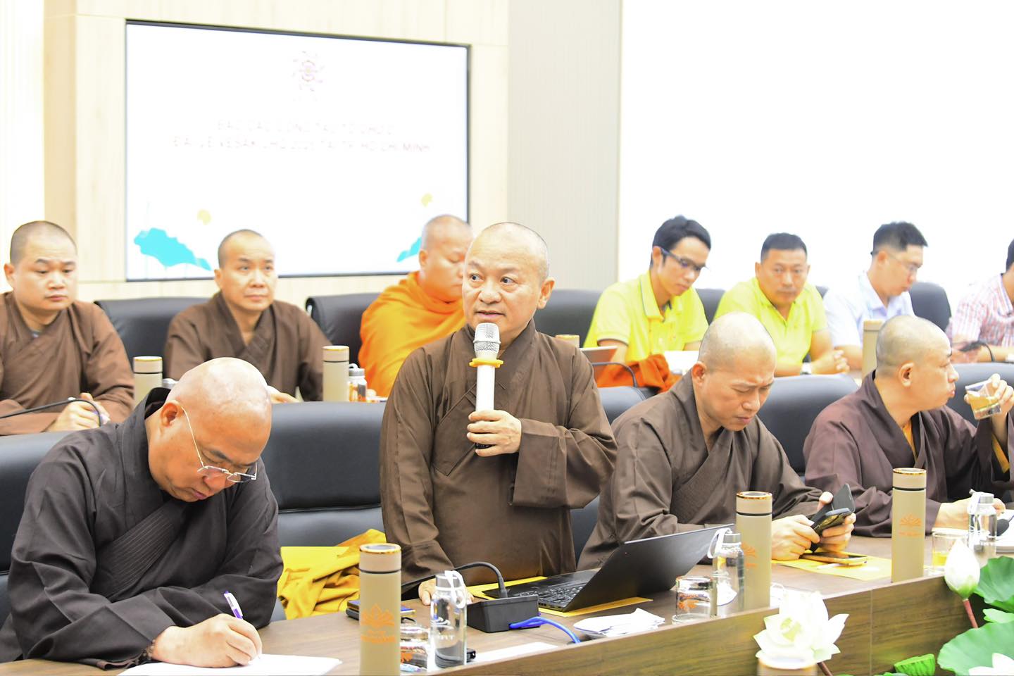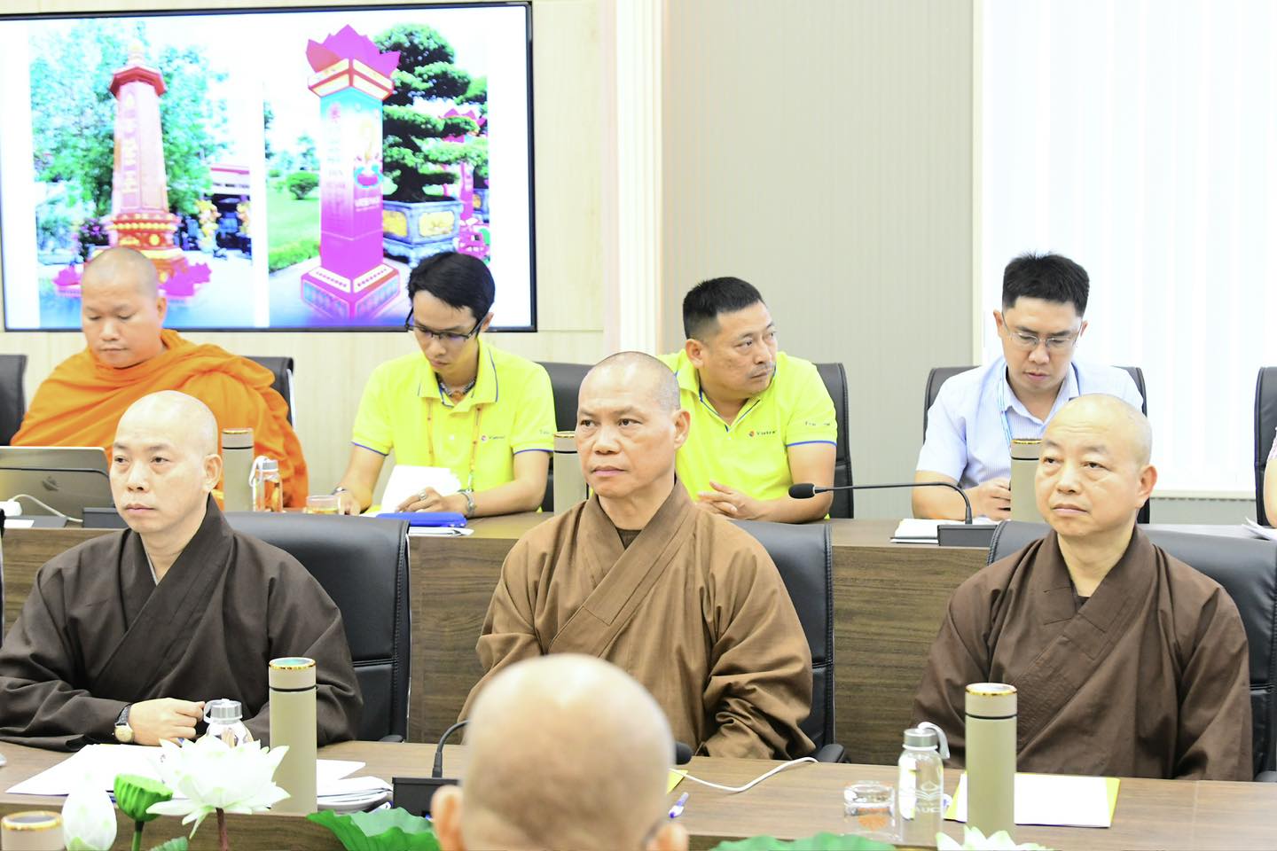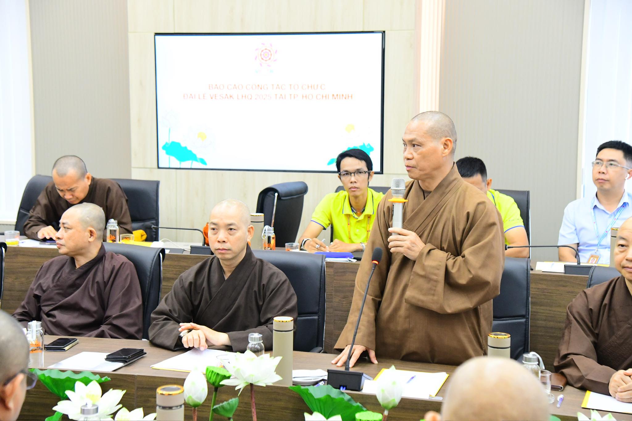 Thượng tọa Thích Nhật Từ, Phó Tổng Thư ký Thường trực Ủy ban Tổ chức, báo cáo về tiến độ các hạng mục như trang trí cổng chào, pano, khu vực đón tiếp, đường di chuyển từ sân bay Tân Sơn Nhất, v.v…