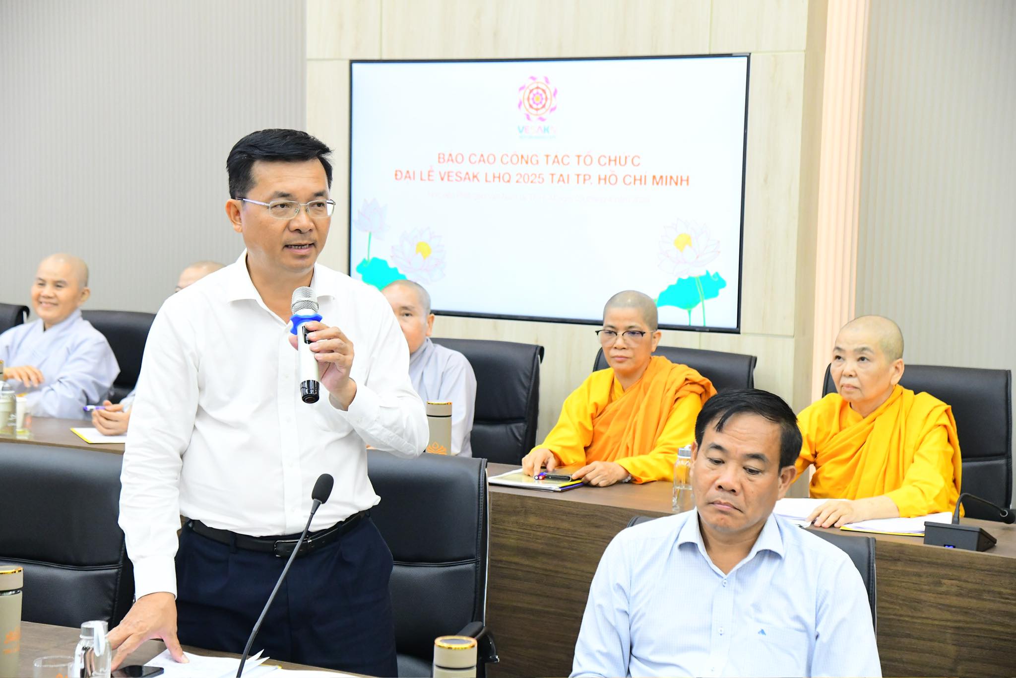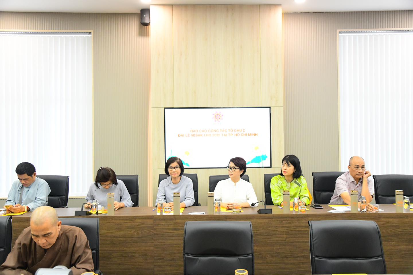 Cuộc họp còn có sự hiện diện của chư tôn đức thuộc Hội đồng Trị sự và các thành viên Ủy ban Tổ chức Vesak 2025. Đại diện các cơ quan chính quyền gồm ông Nguyễn Duy Tân – Giám đốc Sở Dân tộc – Tôn giáo TP.HCM; ông Võ Đức Thanh – Phó Bí thư, Chủ tịch UBND huyện Bình Chánh; cùng đại diện Thành đoàn TP.HCM và Trung tâm Tình nguyện Quốc gia.