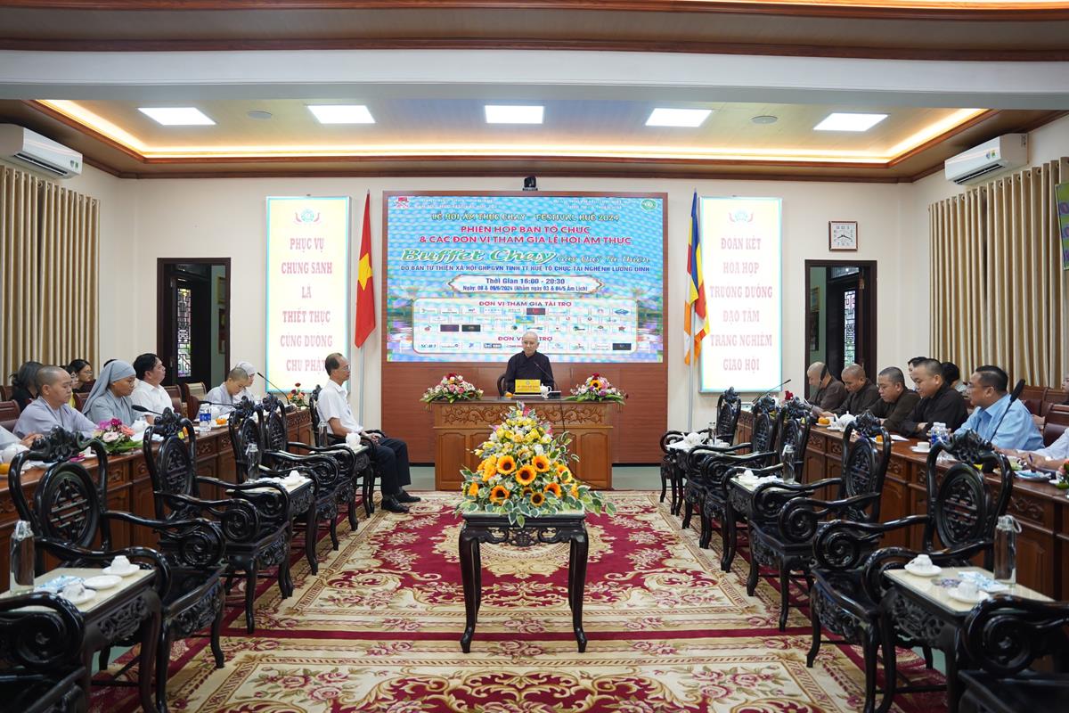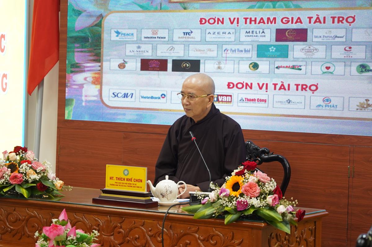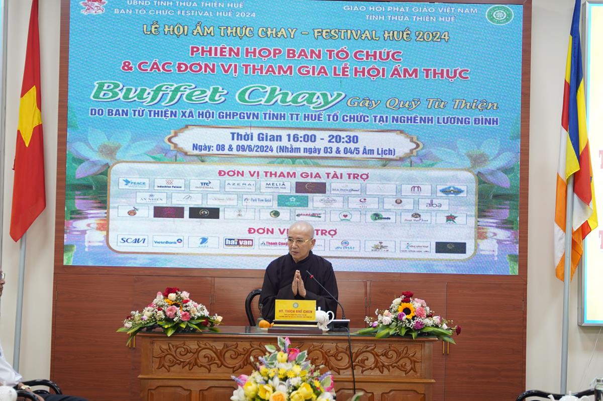 Thay mặt Ban Trị sự, Hòa thượng Thích Khế Chơn đánh giá cao công tác chuẩn bị của Ban Tổ chức Lễ hội Ẩm thực chay – Festival Huế 2024. Hòa Thượng gửi lời động viên, cám ơn đến các đơn vị đồng hành tham gia tài trợ và mong muốn rằng với sự chuẩn bị chu đáo, có kế hoạch cụ thể và sự tham gia tích cực của các đơn vị sẽ tạo ra không khí Lễ hội đặc sắc, phong phú của ẩm thực chay Huế.