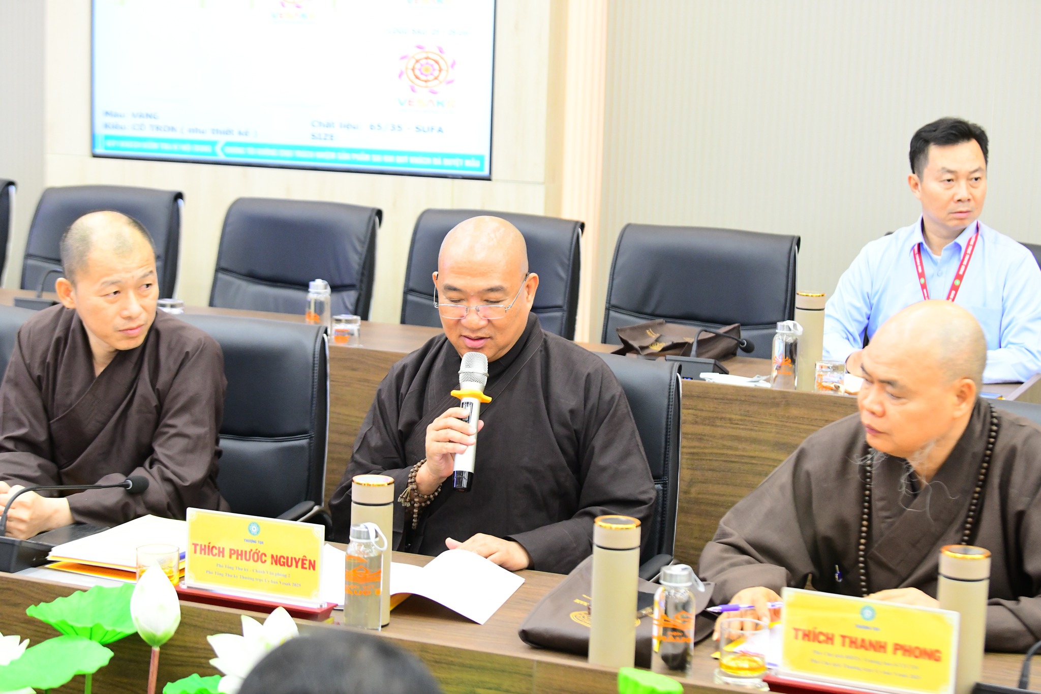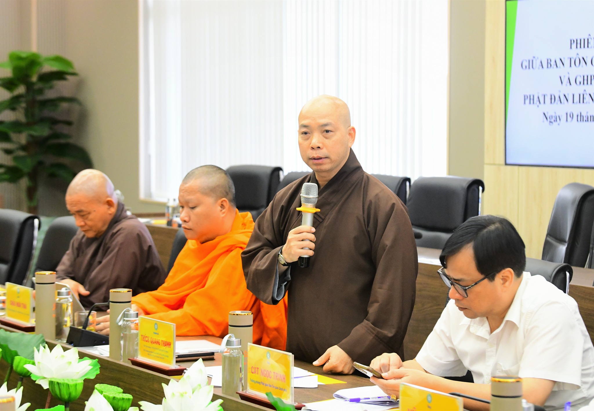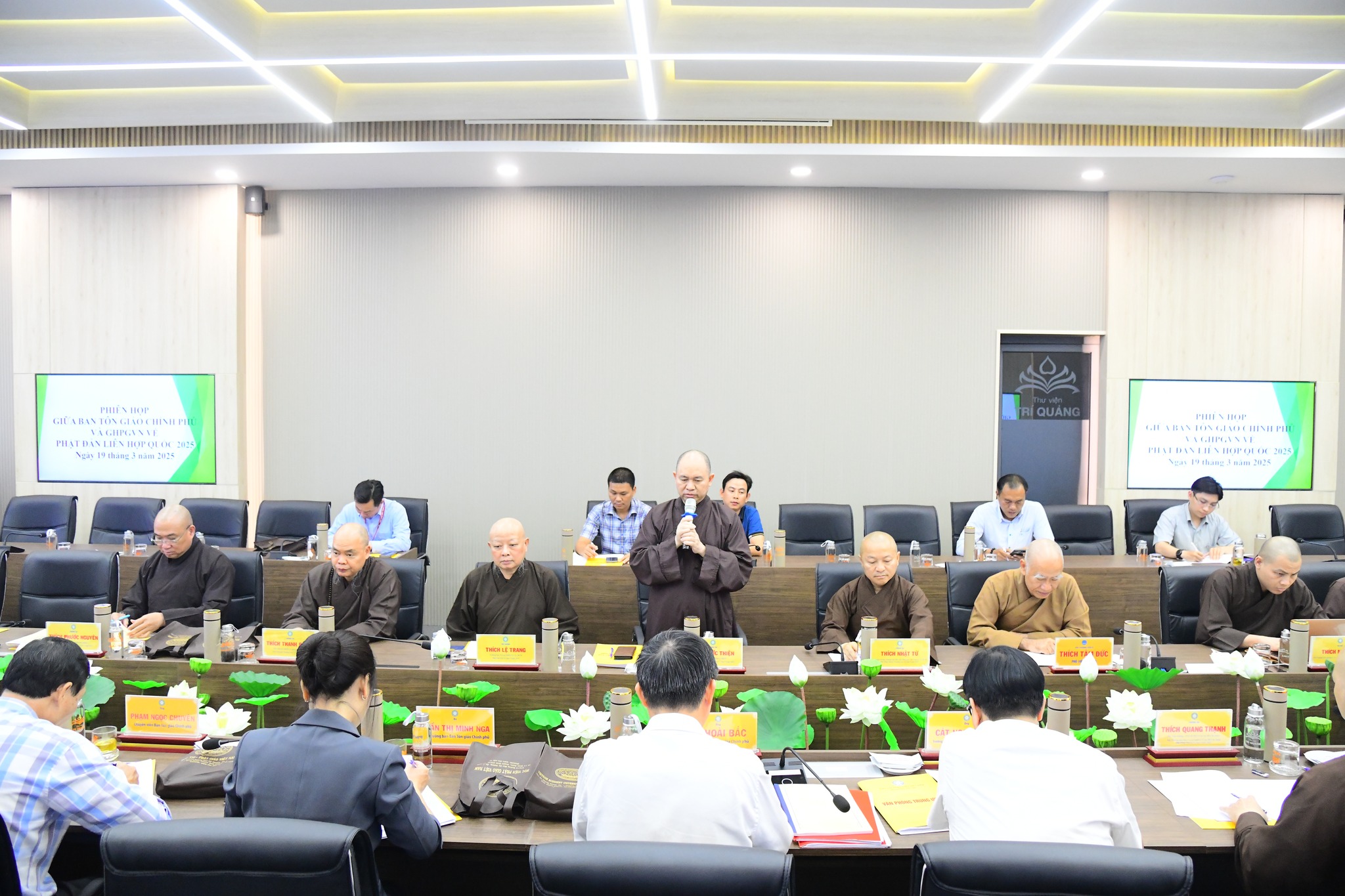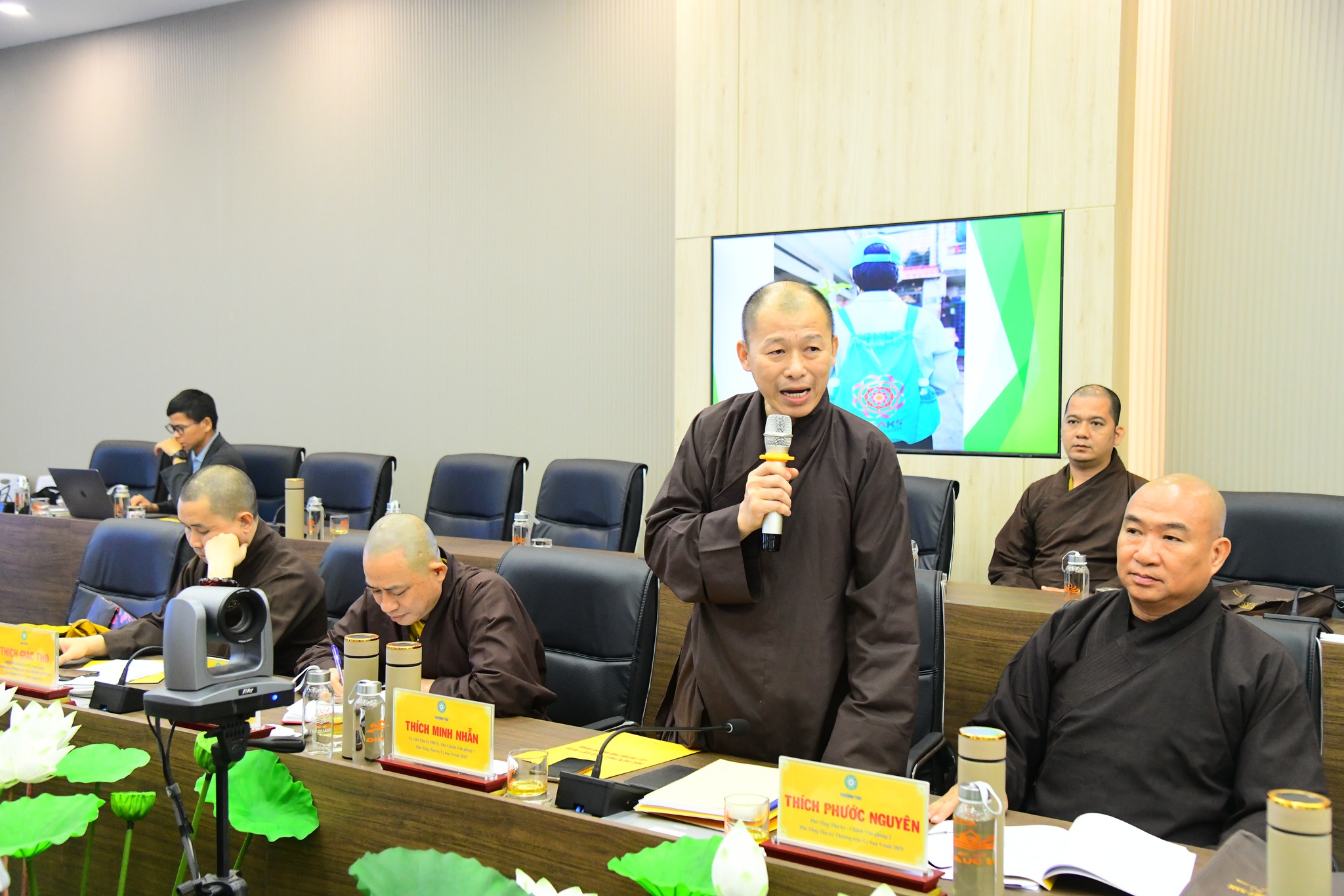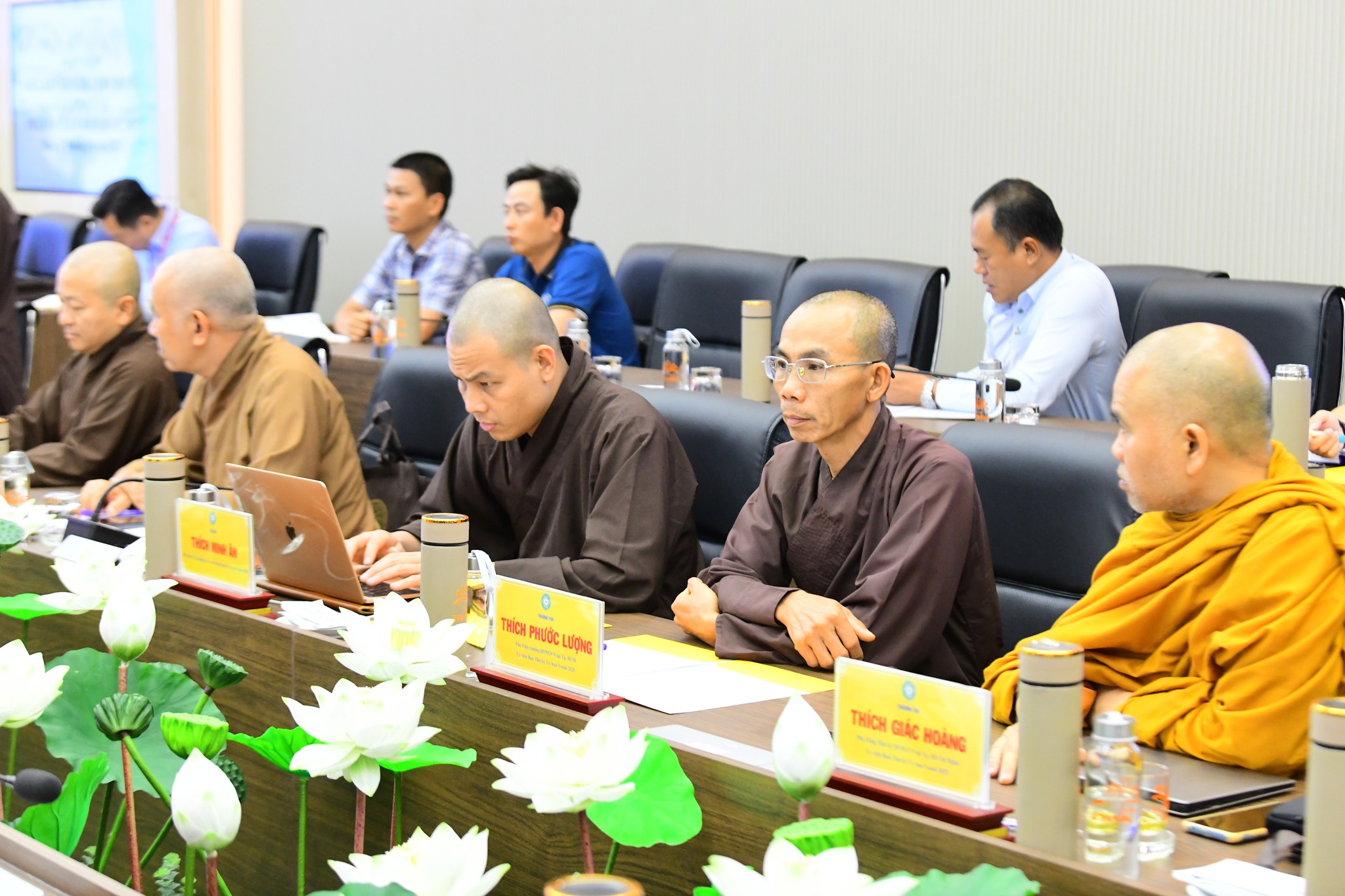 Đi vào cụ thể công tác chuẩn bị, chư tôn đức đại diện các bộ phận hậu cần – văn hoá nghi lễ – hạ tầng – đại biểu – tình nguyện viên lần lượt trao đổi các thông tin liên quan đến lãnh đạo Ban Tôn giáo Chính phủ.