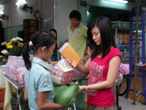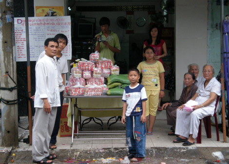 Người được chọn sẽ được phát một cái phiếu, hẹn đến 3g chiều ngày nói trên đến nhà em Tuấn để lãnh gạo. Trước đó một giờ, các Phật tử đã cùng nhau tổ chức cúng thí thực.