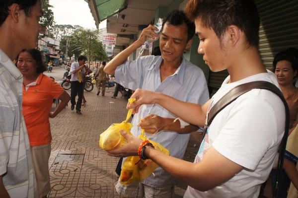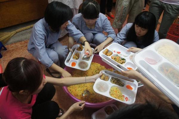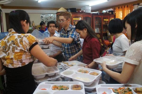 Sau đó mọi người đã di chuyển xuống khu vực nhà bếp, sửa soạn 300 phần cơm chiên dương châu để vào từng hộp cùng với sữa, trái cây … rồi lần lượt mang đến bệnh viện An Bình phát tặng cho các bệnh nhân.