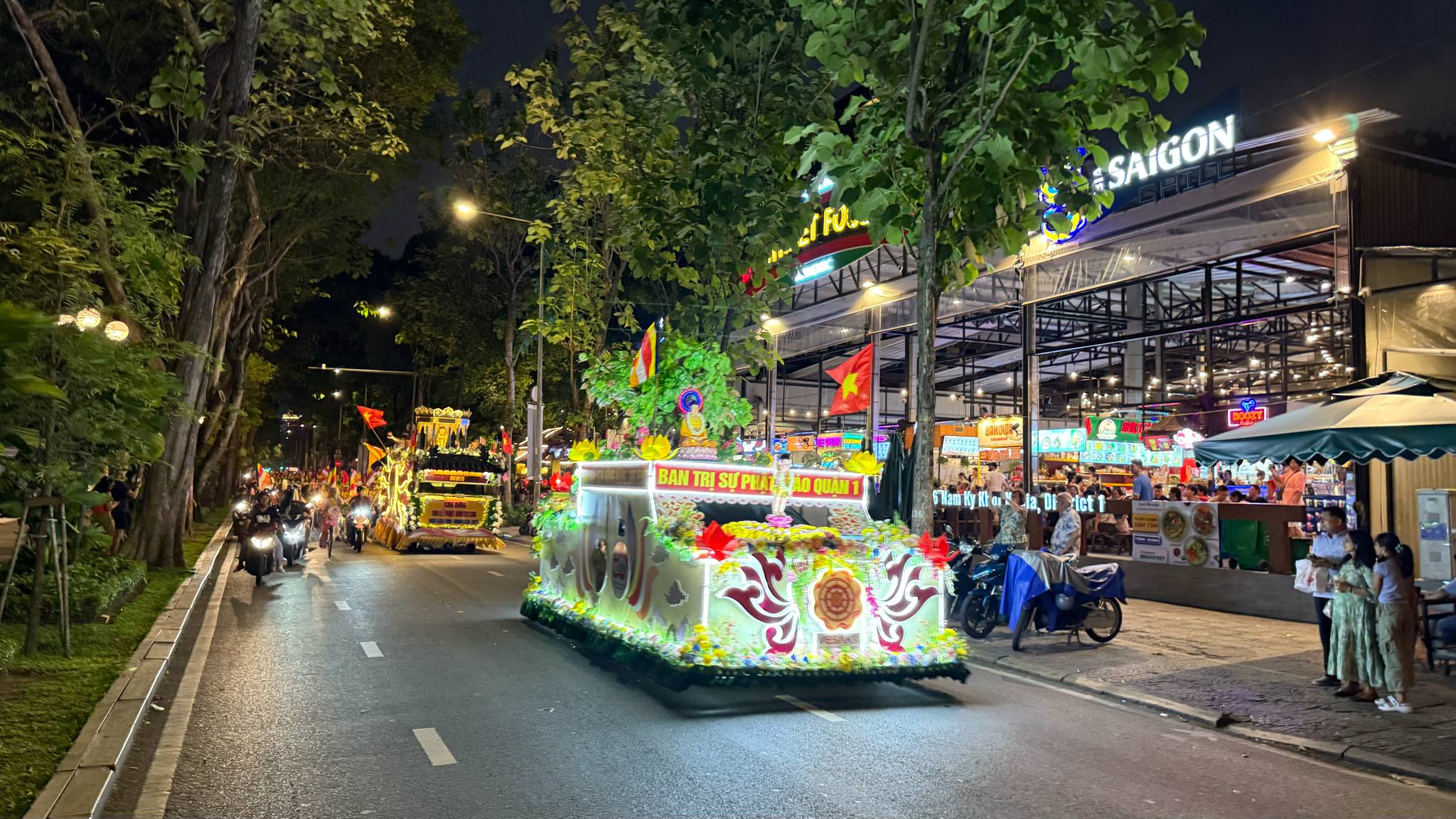 Mỗi xe hoa là một tác phẩm nghệ thuật thể hiện sự sáng tạo và lòng thành kính của chư Tăng Ni và Phật tử Phật giáo quận nhà. Đoàn diễu hành xe hoa xuất phát từ Chùa Vạn Thọ – 247 Hoàng Sa, Phường Tân Định và đi qua các tuyến đường: (Quẹo Phải) Trần Nhật Duật, (Quẹo Trái) Trần Quang Khải, Mai Thị Lựu (Đi ngang Chùa Phước Hải), (Quẹo Phải) Điện Biên Phủ, (Quẹo Phải) Đinh Tiên Hoàng, (Quẹo Trái) Võ Thị Sáu, (Quẹo Trái) Hai Bà Trưng (Quẹo Phải) Lê Duấn, (Quẹo Trái) Nam Kỳ Khởi Nghĩa, (Quẹo Phải) Lê Lợi, Lê Lai (Đi ngang Chùa Quảng Hương), Nguyễn Trãi (Đi ngang Chùa Lâm Tế), (Quẹo Trái) Nguyễn Văn Cừ (Chùa Long An), (Quẹo Trái) Trần Hưng Đạo (Chùa Phật Ấn, Chùa Thiên Phước, Chùa An Lạc), (Quẹo Phải) Hồ Hảo Hớn, (Quẹo Trái) Cô Bắc (Chùa Pháp Hoa Ni Viện), (Quẹo Phải) Đề Thám, (Quẹo Phải) Cô Giang (Đi ngang Tố Đình Linh Sơn, Chùa Pháp Thông, Chùa Linh Phước…),Hai Bà Trưng (Cầu Kiệu), (Quẹo Phải) Hoàng Sa, về lại TĐ Chùa Vạn Thọ và kết thúc ngày diễu hành. Không khí diễu hành càng trở nên rộn ràng và ấm áp hơn với sự hiện diện đông đảo của người dân hai bên đường.